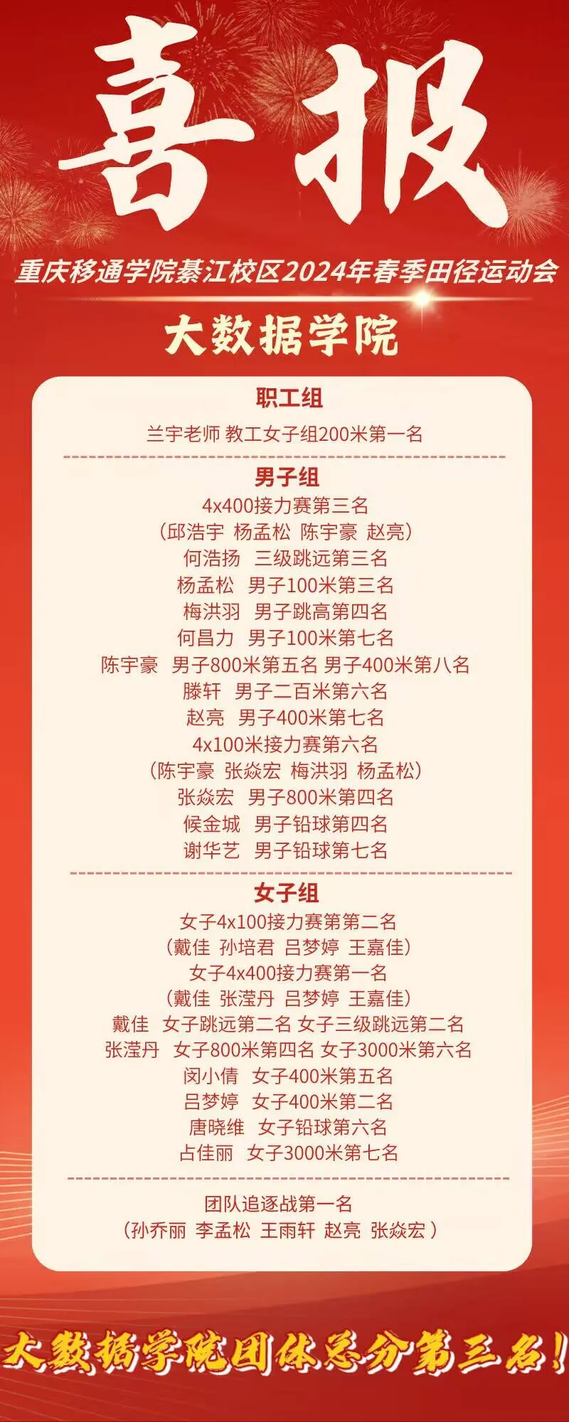 重庆移通学院(綦江校区)2024年春季田径运动会第二天,不期而遇的雨水增加了决赛项目的难度,但大数据学院的运动员们并没有因此退缩,他们用实际行动诠释了什么是真正的体育精神!