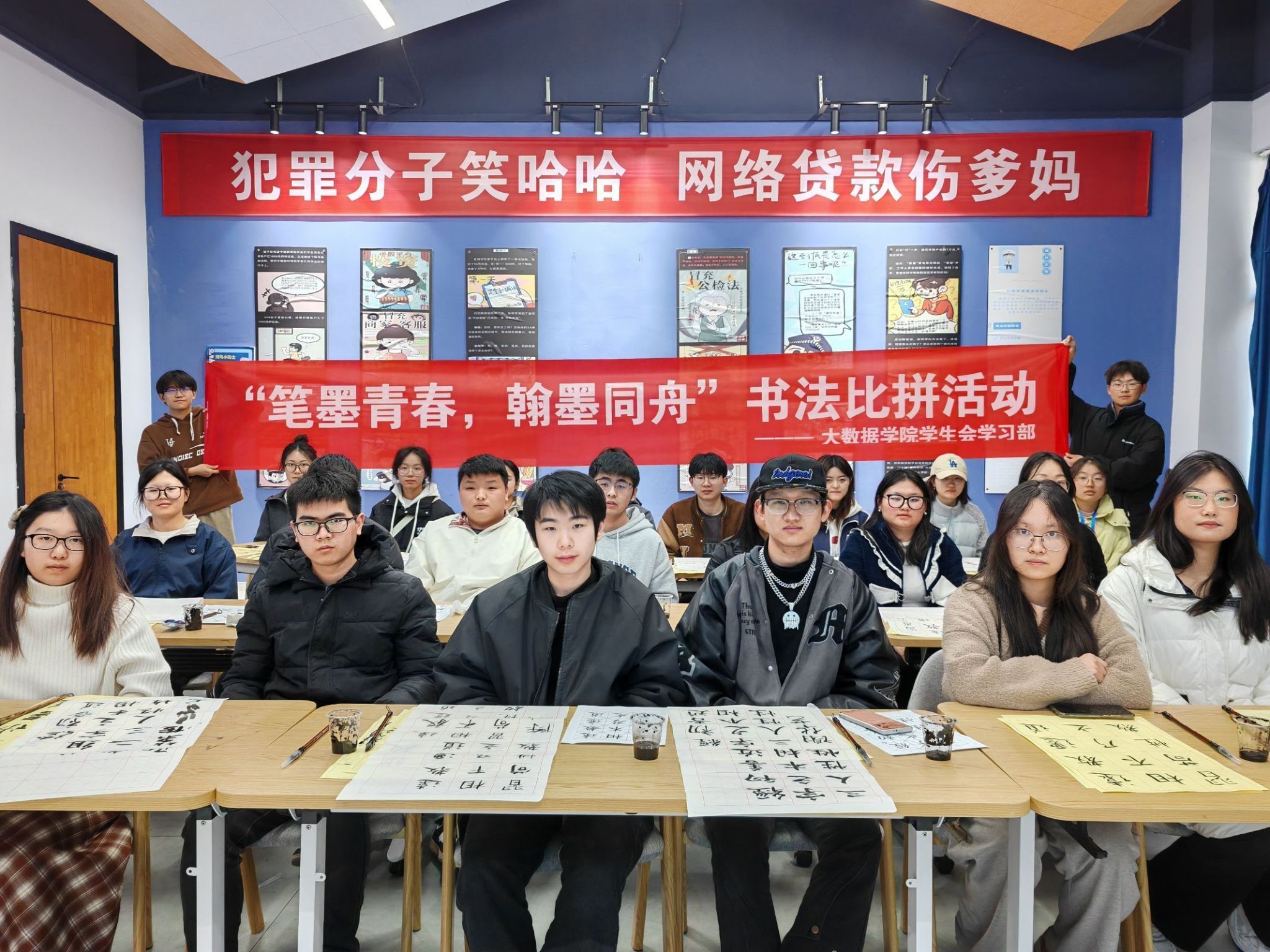 笔墨青春展风采,翰墨同舟传薪火。为弘扬中华优秀传统文化,激发青年一代对书法艺术的热爱与传承,大数据学院学习部于2025年3月19日16:30-18:00在綦河书院南渊·创写活动室成功举办“笔墨青春,翰墨同舟”书法作品比拼活动。本次活动以书法为纽带,吸引了众多书法爱好者参与,大家积极参与活动展示自己的作品,相互交流与学习相关书法知识,展现了新时代青年的文化自信与艺术创造力。