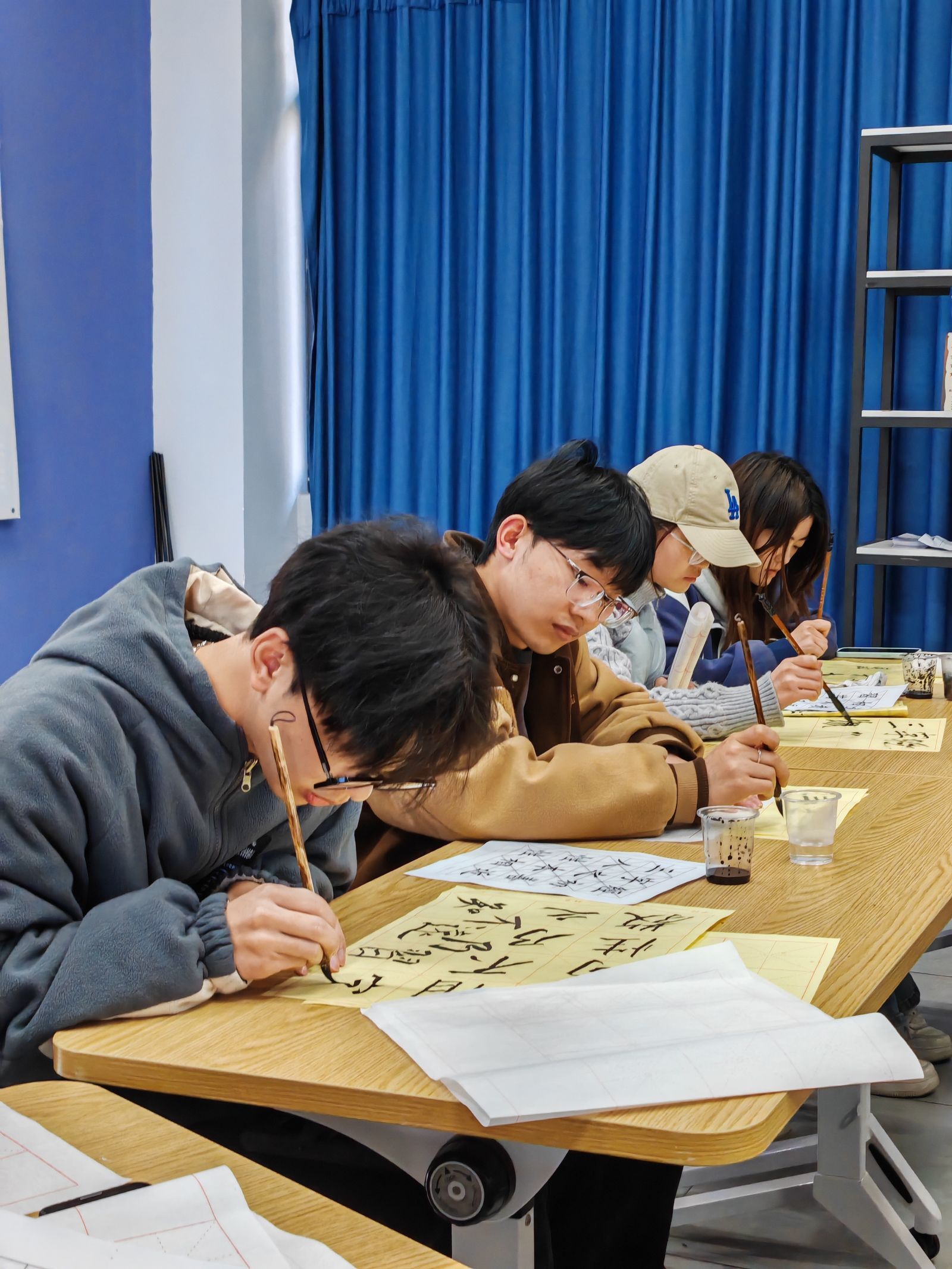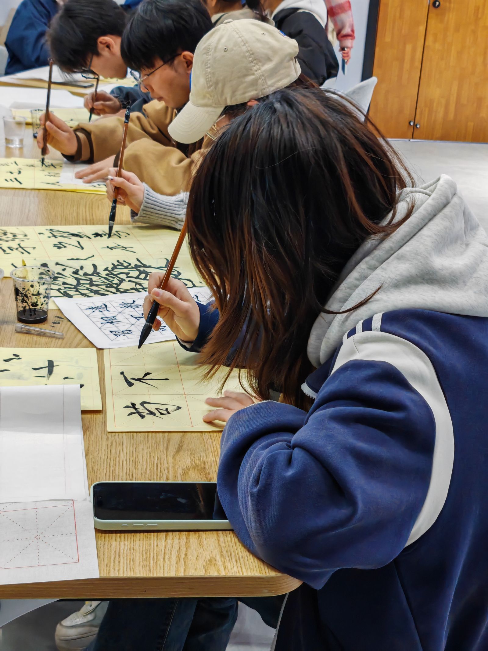 活动自启动以来,受到许多同学的关注。活动开始先由工作人员向大家简单讲解了单钩、双钩、枕腕、悬肘等握笔姿势,楷书、行书、隶书、篆书等传统书体。然后,将参与活动的同学分为了五个小组,以小组成员接力方式完成书法创作。现场还设置了书法知识竞答环节,同学们积极参与竞答,小组成员之间团结协作,现场氛围十分火热。最终评审团将从笔法、结构、章法、小组完成速度等维度综合评选,分别评出第一名、第二名、第三名。