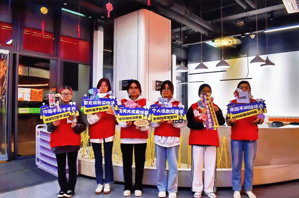 尤为引人注目的是,活动现场还设置了一个特别的环节——工作人员们手持精心设计的防诈小KT板,这些KT板上绘有生动的防骗图案和醒目的标语,如“网络购物要小心,反复要钱是陷阱”、“飞天大奖莫惊喜,让你掏钱洞无底”等。带领同学们齐声高呼着响亮的防骗口号,不仅彰显了他们对防诈知识的深刻理解和坚定信念,更将这份正能量传递给在场的每一个人。这一刻,防骗不再是一个简单的词汇,而是成为了他们心中共同的信念和行动指南。