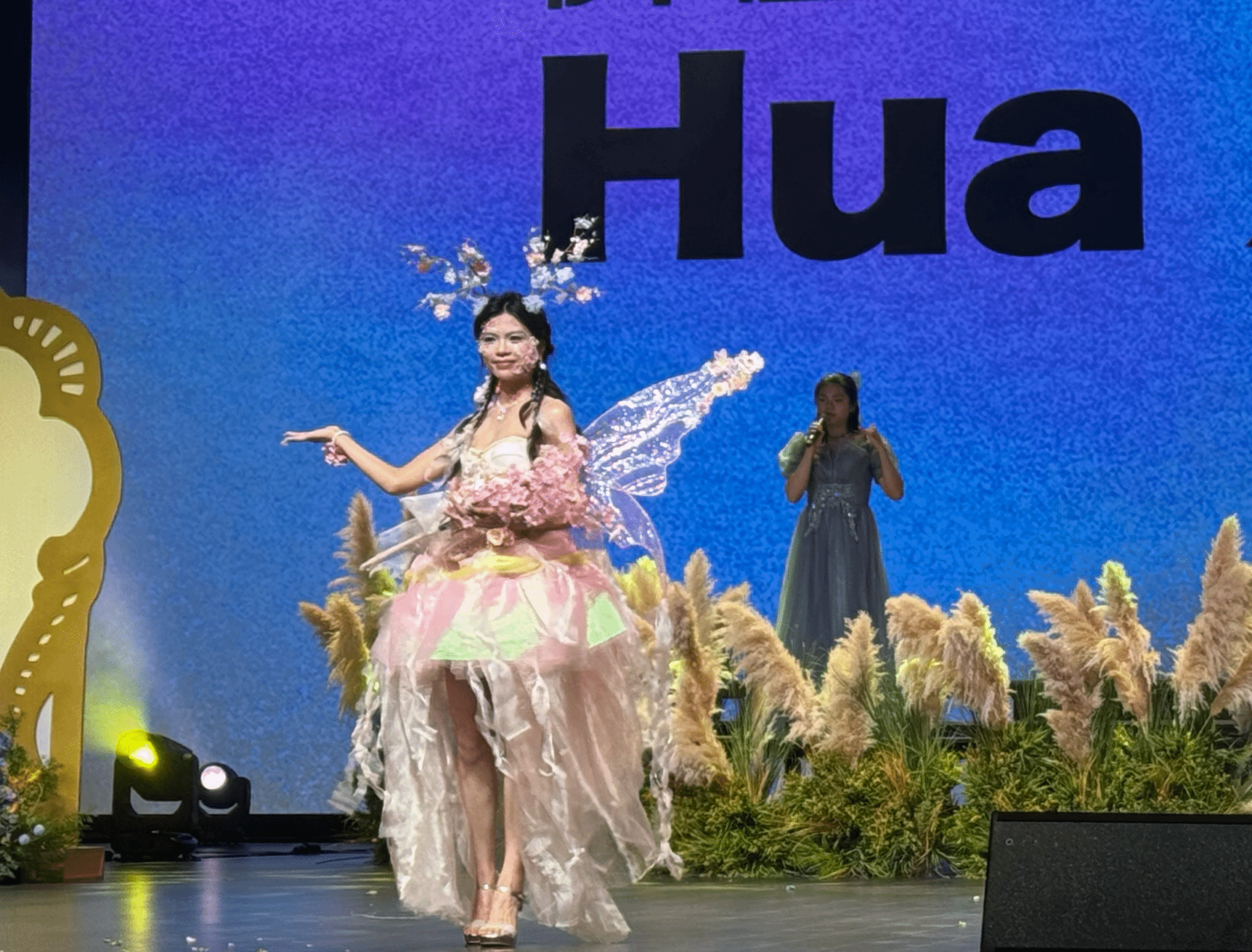 张露同学的题目为“花仙”,妆造仿若花中精灵,妆容清透灵动,面部以繁花作为点缀,似初绽花蕊,与整体造型相得益彰,发型为双麻花辫垂于肩头,编入彩色丝带,有如自林间采撷的浪漫。头上花枝造型装饰精巧别致、繁花拥簇,似在诉说春日秘语。身着一袭珠光粉裙摆的薄纱裙装,轻盈如羽。裙上装饰精致花朵,与头饰相呼应,背后选用薄透碟翼,纹理细腻,仿佛下一秒就能振翅穿梭于花丛间,将梦幻与灵动完美融合,尽显戏剧影视妆造的绮丽巧思。