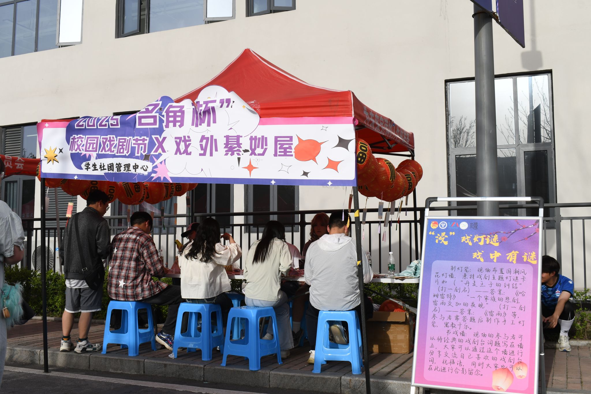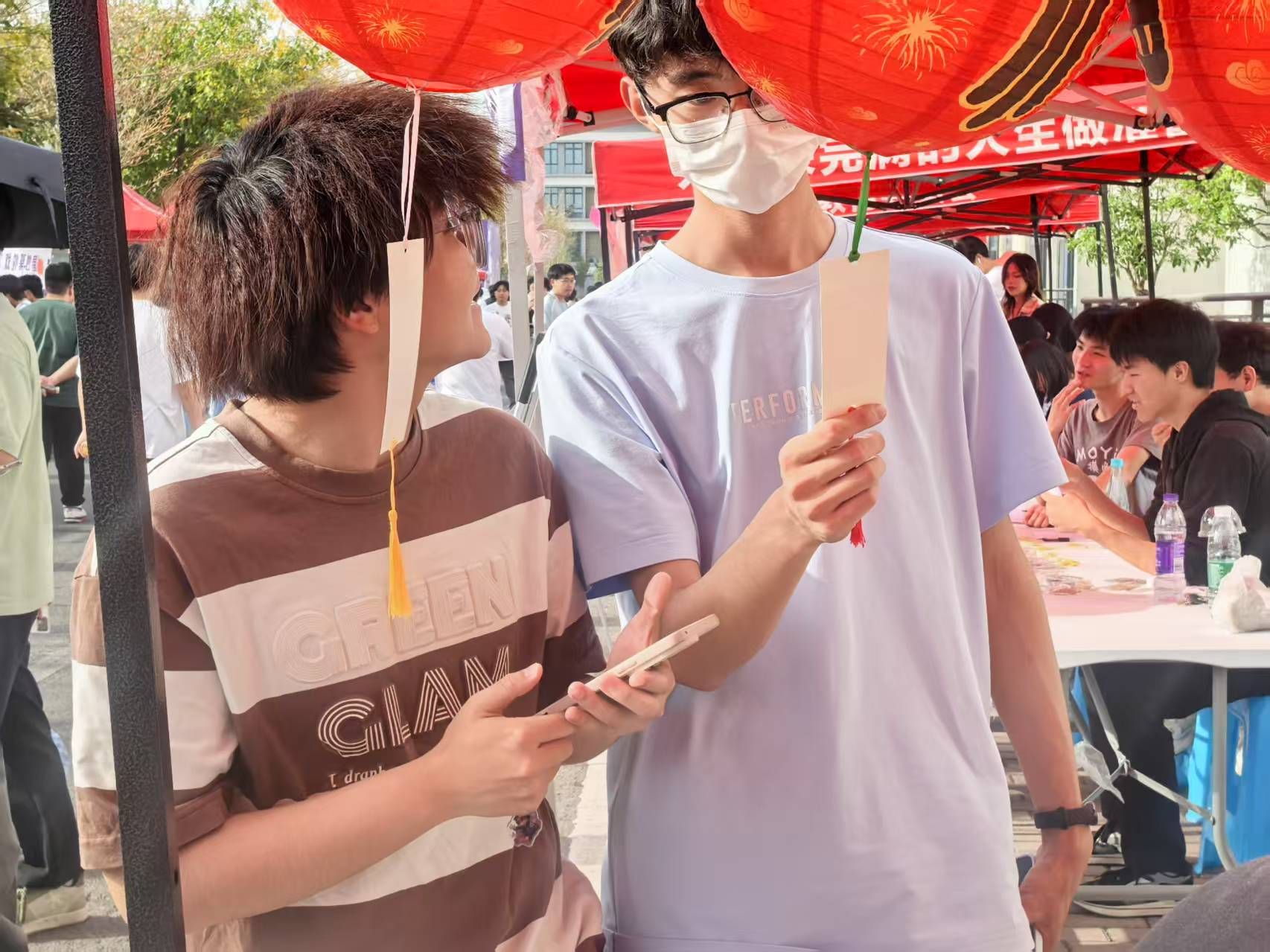 活动现场,其布置极具传统韵味,精美的花灯墙格外引人注目,70个灯笼高高挂起,暖黄色的光透过不同颜色的花灯发出五彩的光晕,映射在同学们的笑脸上。再次走进,可以发现我们精心准备的70张灯谜卡片,它们正随风摇曳。这些灯谜每一个都巧妙地融合了戏曲元素,如“丹麦王子的纠结”(打一剧名),谜底是《哈姆雷特》;“一个家族的悲剧,雷雨交加的夜晚”对应《雷雨》 ;“她是罗密欧的爱人”答案则是朱丽叶。同学们穿梭在花灯墙前,兴致勃勃地从花灯墙上摘下卡片,或驻足凝视,眉头紧锁思考谜题;或三两成群,与同伴热烈地讨论,各抒己见。随后前往打卡区验证答案,现场气氛十分活跃,大家都沉浸在猜灯谜的乐趣中。
