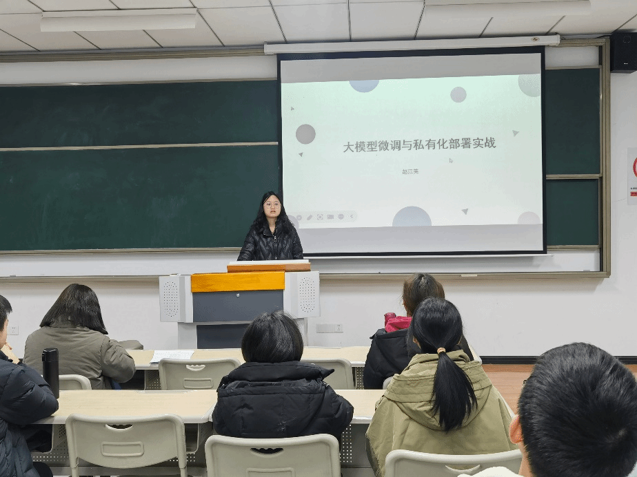 随后,赵江芙老师分享了她在“大模型微调与私有化部署实战”研修中的学习经历。她参与了“基于大模型微调的命名实体识别”、“基于大模型微调的新闻文本分类”、“基于大模型的校内问答系统”在内的多个项目,深入学习了Transformer的原理与实现与PyTorch框架基础实践。赵老师强调,此次培训极大地丰富了她在人工智能与深度学习方面的知识,增强了她的大模型实战能力。