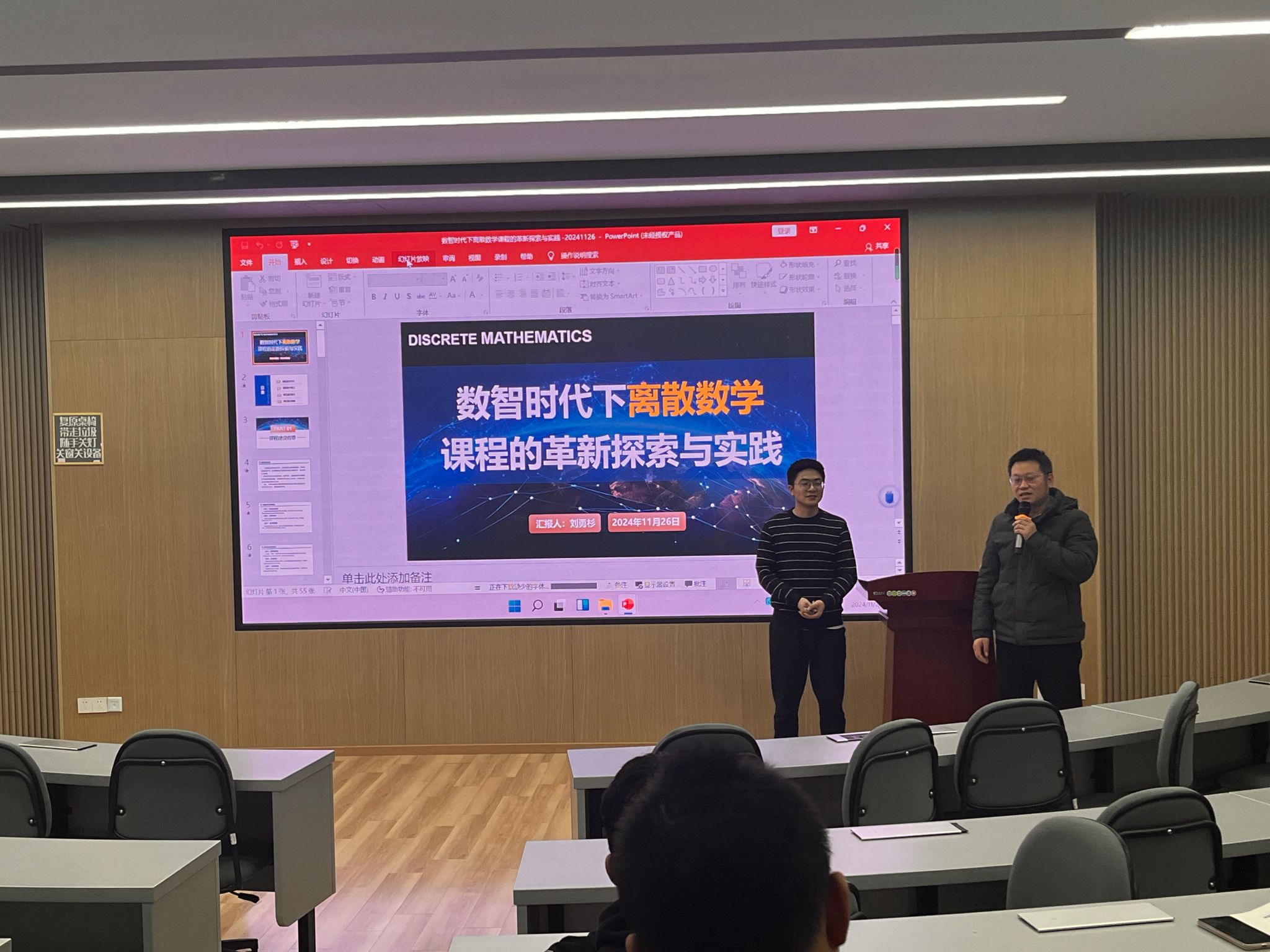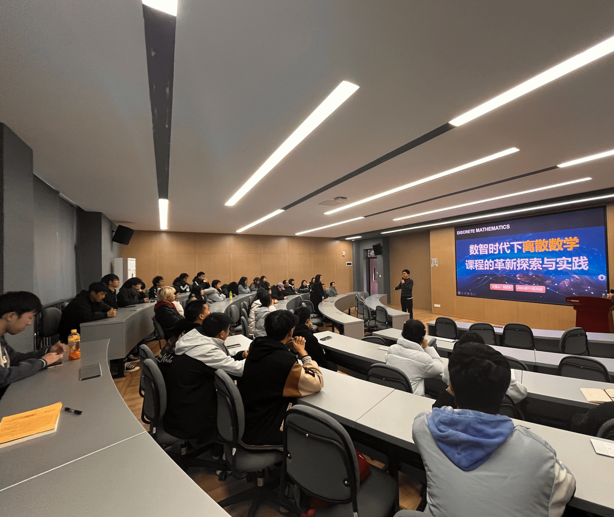 在数智时代蓬勃发展的大背景下,离散数学作为众多前沿技术的核心理论基础,其教学的革新对于培养适应时代需求的创新型人才至关重要。为了让大数据学院的师生深入了解离散数学课程在新时代下的发展趋势、面临的挑战及应对策略,提升学院整体教学水平,推动学科建设与人才培养质量的提升, 11 月 27 日下午 3 点,重庆移通学院大数据学院于智者楼 304 成功举办了一场关于离散数学课程革新的精彩讲座。本次讲座特别邀请到重庆邮电大学的刘勇杉教授主讲,吸引了大数据学院众多专任教师和学生的积极参与,由大数据学院教学副院长吕云山主持。