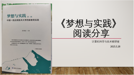 为深入领会董事长教育理念精髓,凝聚全体教师思想共识与行动合力,计算机科学与技术教研室于 2025 年 5 月 28 日下午 2 时 30 分,在我校绿意盎然、书香弥漫的花果书院大型会议室,举办了一场围绕董事长著作《梦想与实践》的深度阅读分享会。
