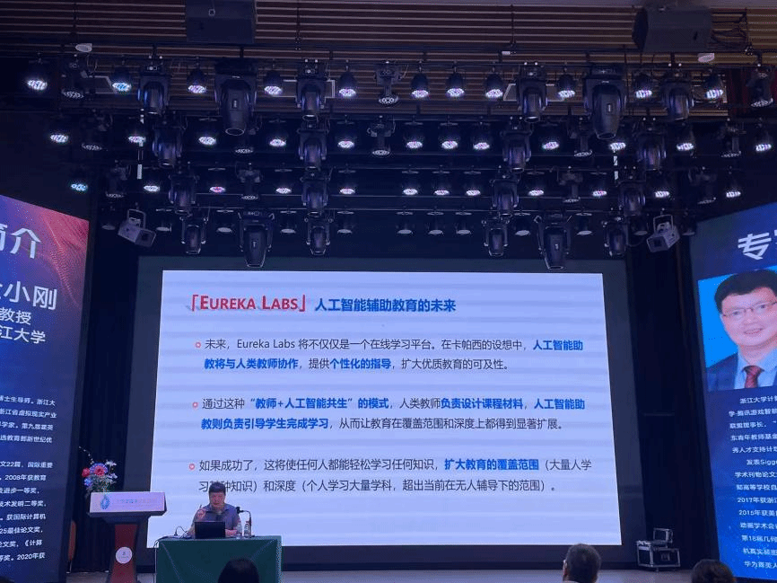 浙江大学金小刚教授在《人工智能重塑教育》讲座中提到AI助教可提供“一对一”精准指导,赋能个性化学习路径设计,并打破地域限制促进教育公平。“未来教育将是人类智慧与机器智能的深度融合,教师需主动拥抱技术,构建‘教师+AI共生’模式。”金教授在VR技术专场进一步指出,虚拟现实能突破时空限制,打造沉浸式历史场景与科学实验环境,让抽象知识具象化。