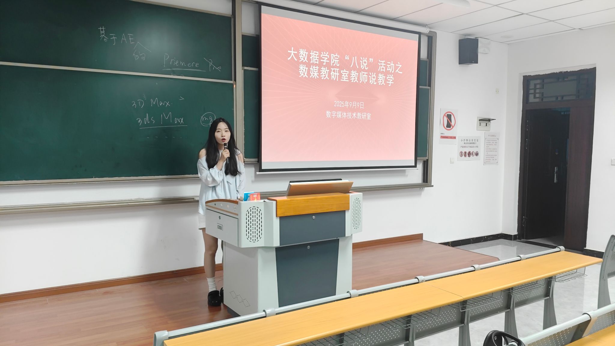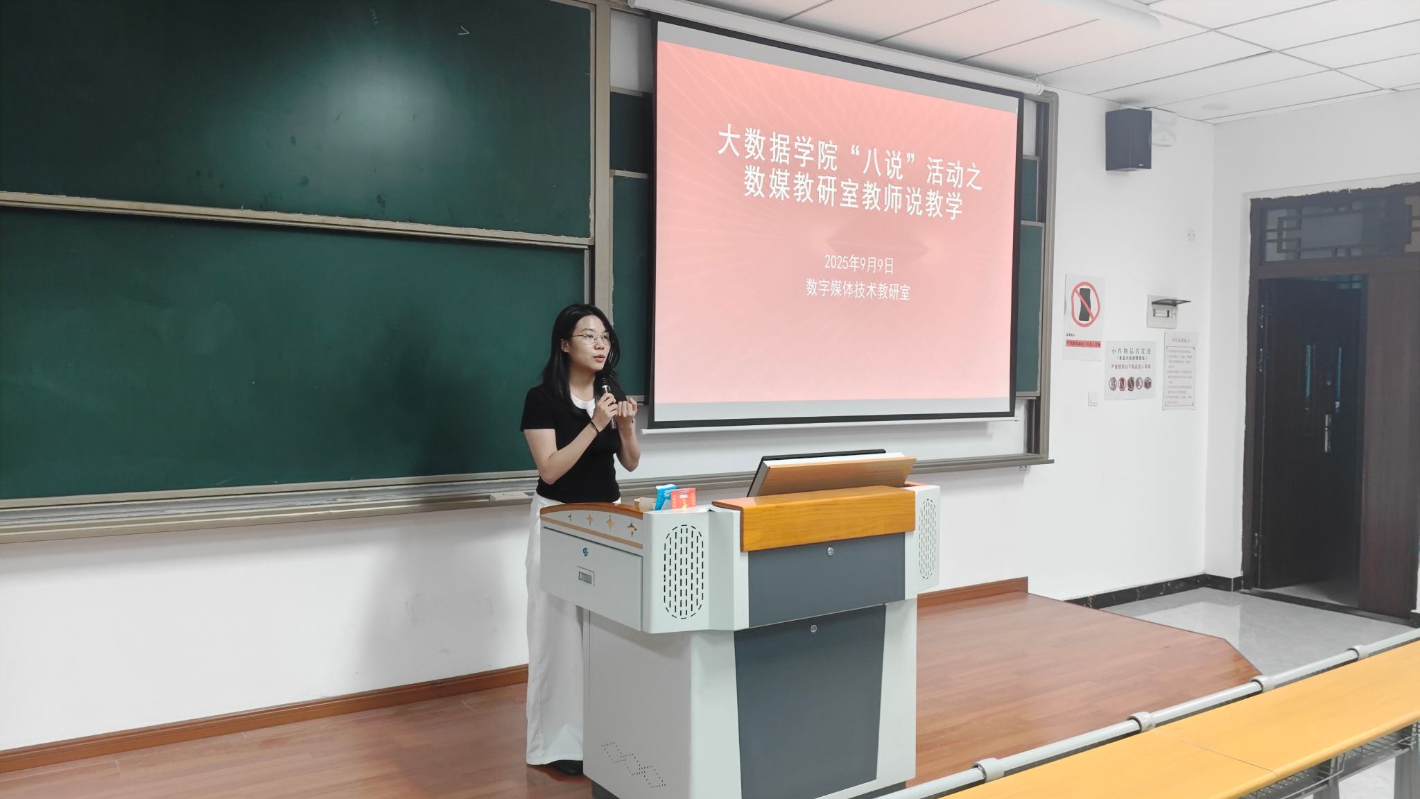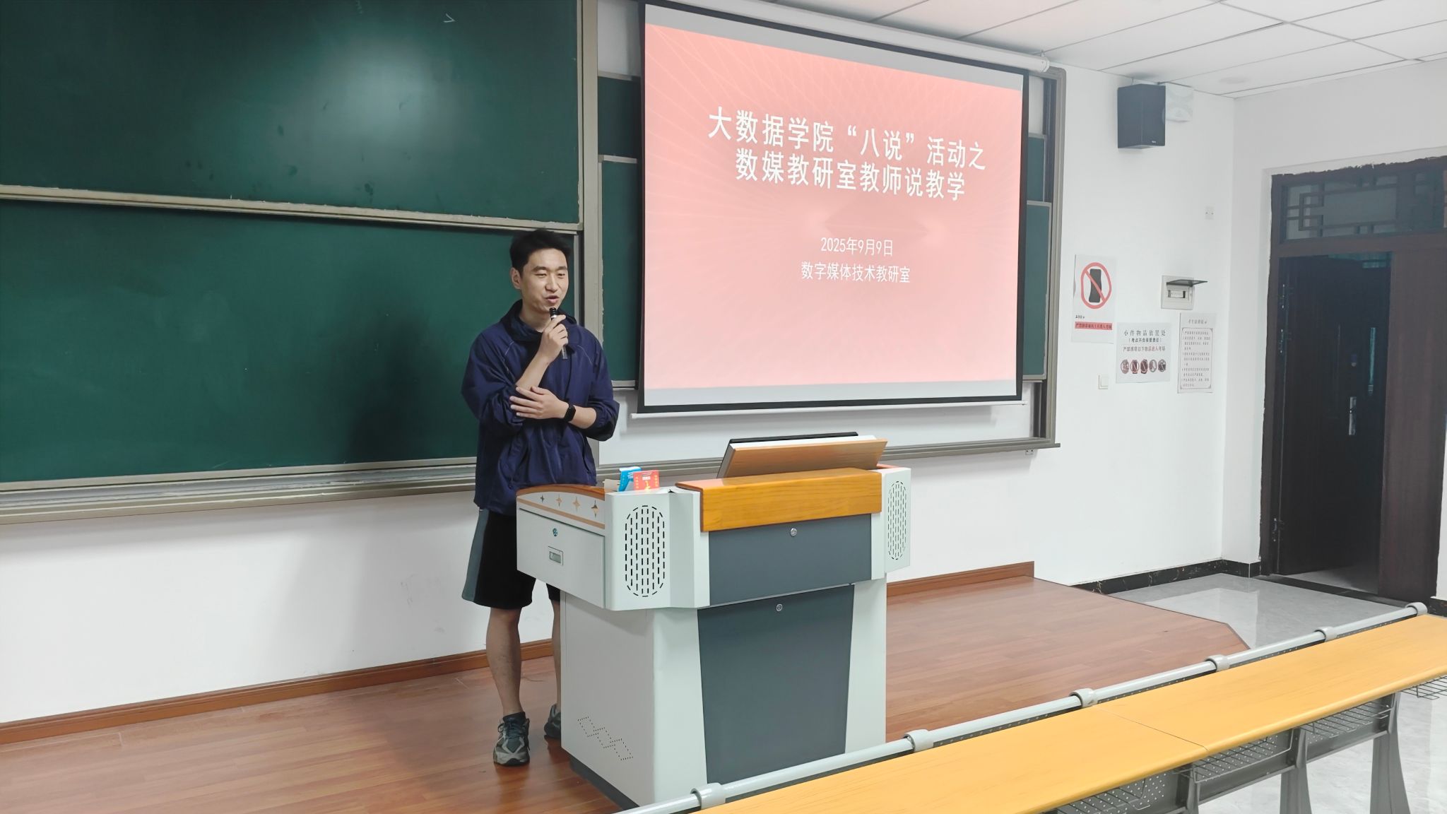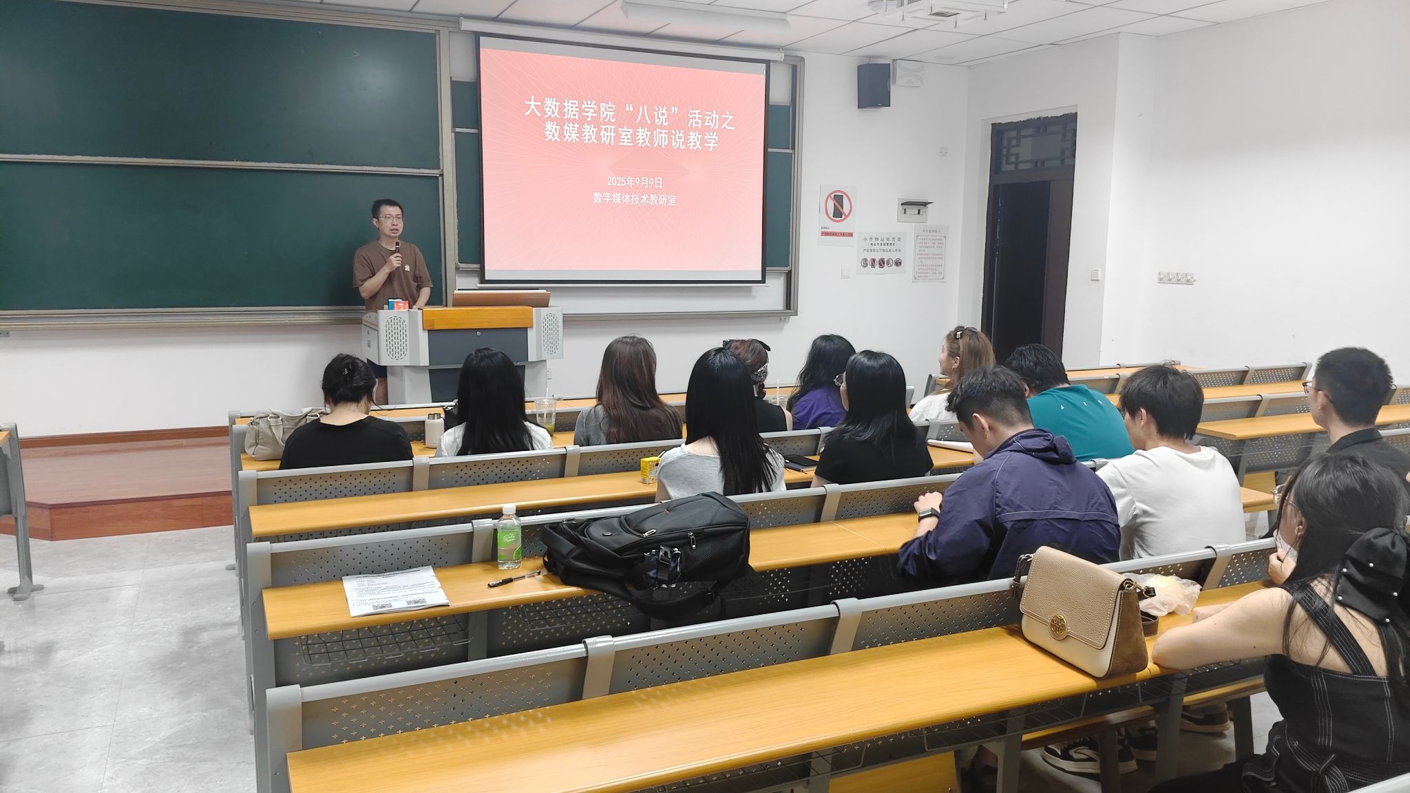 为扎实推进本科教学合格评估准备工作走深走实,确保教学成效梳理、课程建设总结等核心任务精准落地,9 月 9 日下午,大数据学院数字媒体技术教研室于勤者楼 404 教室专题开展 “八说” 系列活动。本次活动由数字媒体技术教研室主任蔡宇老师主持,以 “教师说教学” 为核心主题,采用 “主讲人专题陈述 + 现场互动研讨” 的形式,系统复盘教研室在课程体系优化、教学模式改革等方面的成果,为后续评估专家进校访谈筑牢基础。