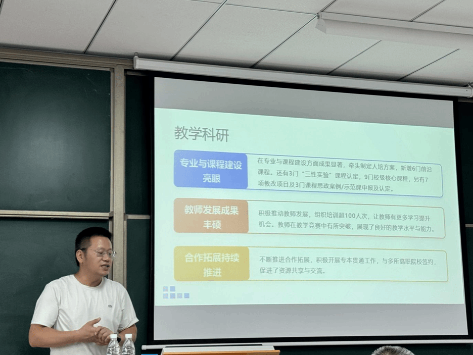 在教学科研方面,吕院长展示了学院取得的丰硕成果:牵头制定了人才培养方案,新增6门前沿课程,3门"三性实验"课程获得认定,9门校级核心课程建设取得突破,7项教改项目顺利推进,3门课程思政案例/示范课成功申报。这些成果充分体现了学院在教学改革创新方面的积极探索。
