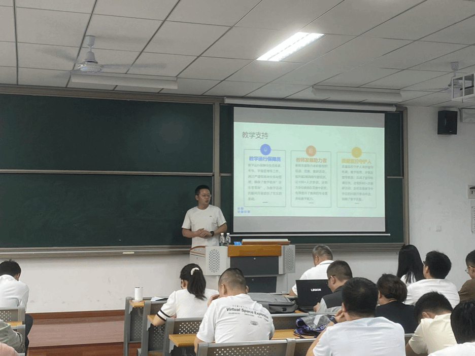 在"精准赋能,全面支撑"方面,吕院长详细介绍了学院教学管理的三大支撑体系:一是教学运行保障体系,确保教学秩序平稳有序;二是教师发展支持体系,全年组织达100余人次的培训,助力教师专业成长;三是质量监控守护体系,建立健全教学质量保障机制,持续提升教学质量。