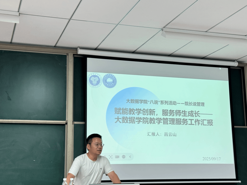 2025年9月17日,大数据学院在勤者楼410会议室举行了"八说"系列活动之"院长说管理"专题报告会。教学副院长吕云山以"赋能教学创新,服务师生成长——大数据学院教学管理工作汇报"为题,全面阐述了学院教学管理工作的理念、实践与展望。各教研室主任、教师代表及教学管理人员参加了本次会议。