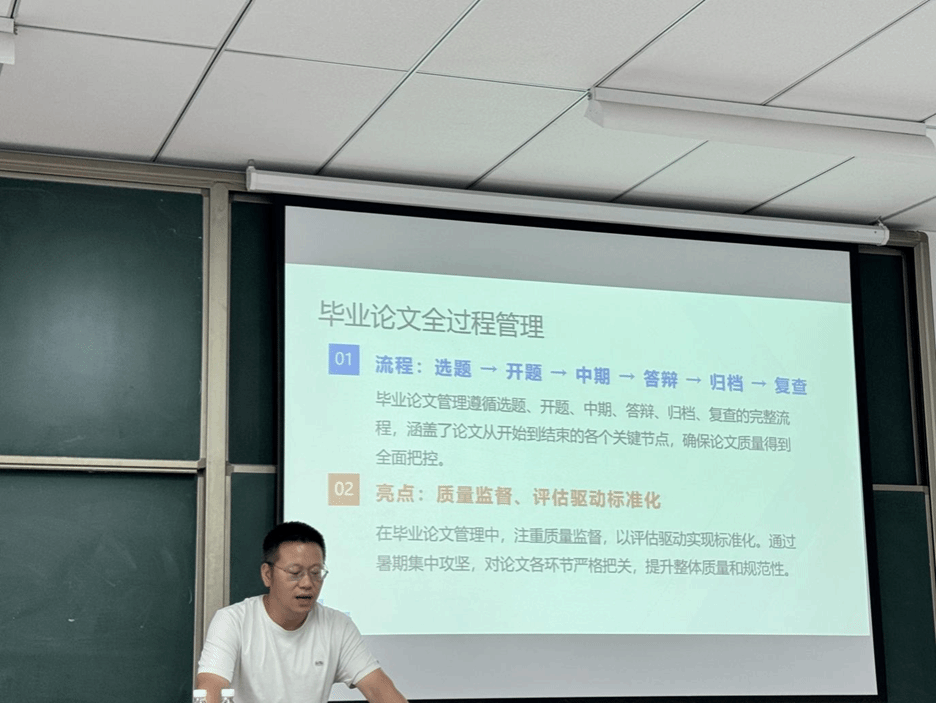 针对毕业论文管理工作,吕院长重点介绍了全过程质量管理模式。通过严格流程把控、强化监督与评估驱动等措施,学院实现了毕业论文工作的标准化、规范化管理。这一模式有效提升了毕业论文的质量,为学生顺利完成学业提供了强有力保障。