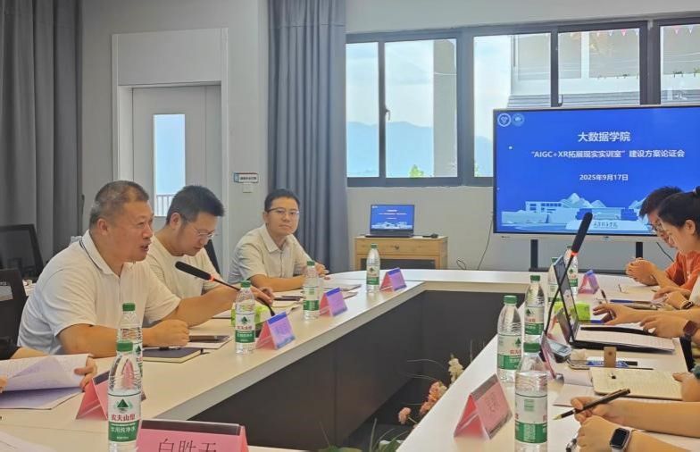 9月17日下午,大数据学院在玉棠书院地心会议室召开“AIGC+XR拓展现实实训室”建设方案论证会。院长潘显兵、教学副院长吕云山,校内各部门专家代表(资产管理处处长白胜天、戏剧影视学院副院长秦琦琅、教务处吴颖、实验教学管理中心向春红与刘俊伯、网信中心秦连键),方案制定人员(虚拟现实技术专业教研室主任闫攀、专业负责人罗小波),以及企业专家(汉沙数字科技集团有限公司副总裁谢理成、CTO 乐士枫)出席会议。