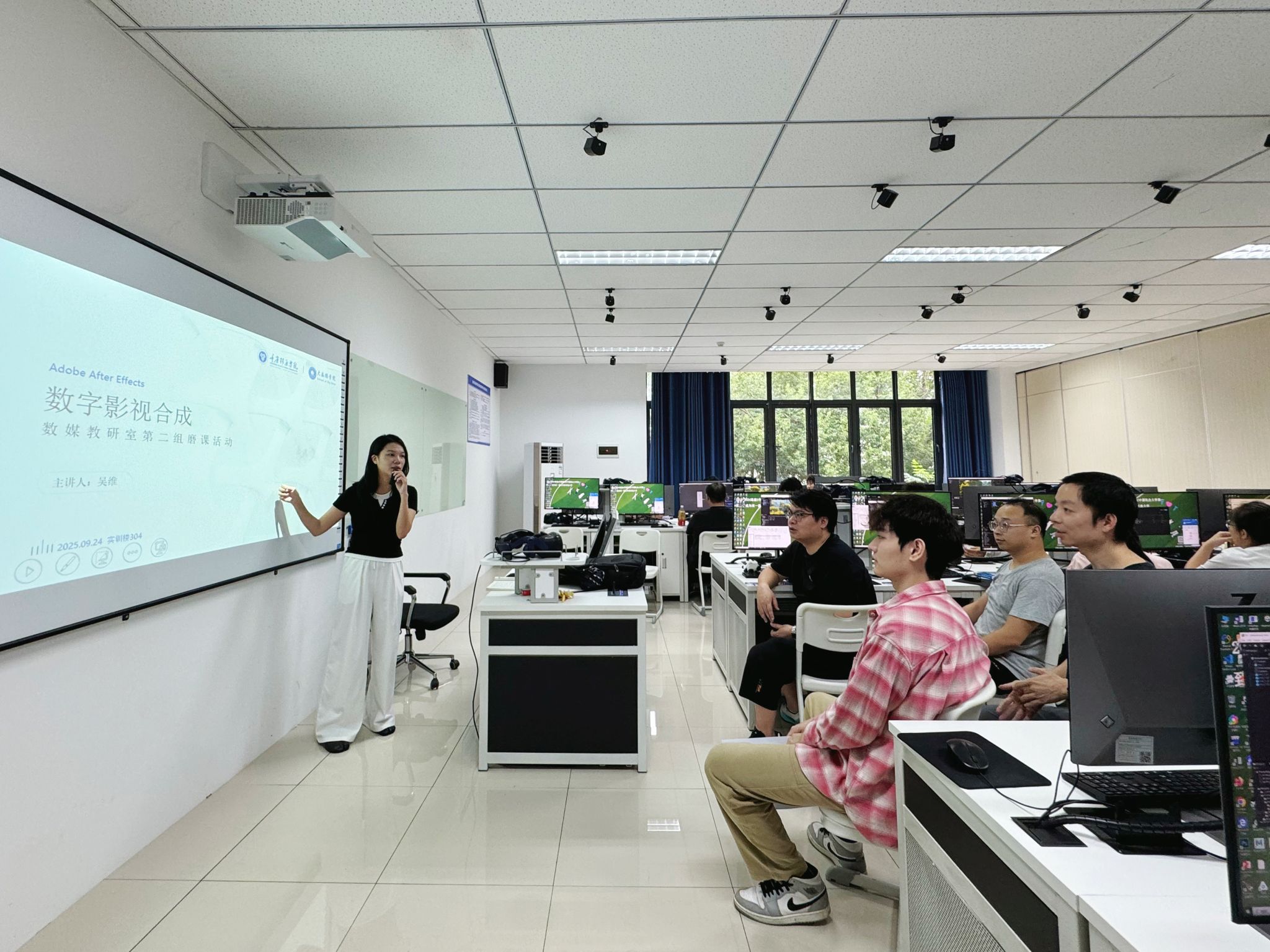 为进一步优化《数字影视合成》课程教学内容与方法,突破After Effects软件中关键帧动画这一核心技能的教学重难点,提升学生动态视觉设计与制作能力,2025年9月24日早上8:00,课程组在实训楼304教室开展了专题磨课活动。本次磨课由吴维老师主讲,聚焦于“AE关键帧:动态设计的灵魂”这一核心主题。教研室向飞、钟翔、茅志坤、张钰潇四位老师全程参与听课,并在课后围绕关键帧教学的理论深度、实践应用与课堂互动展开了深度研讨,为教学优化提供了有力支撑。