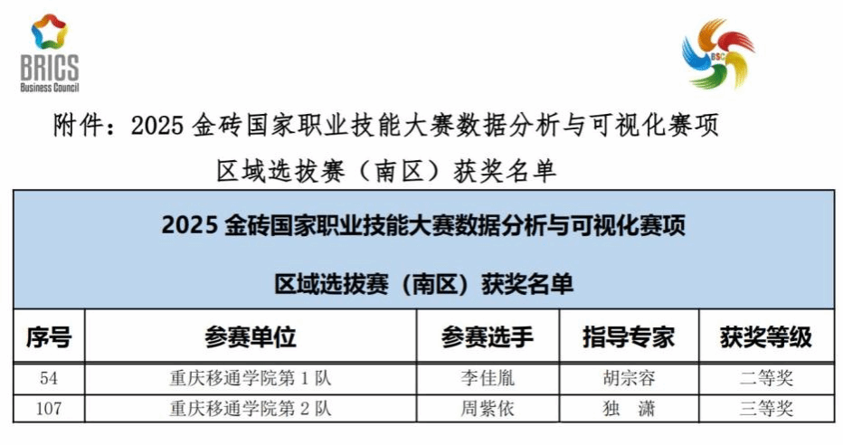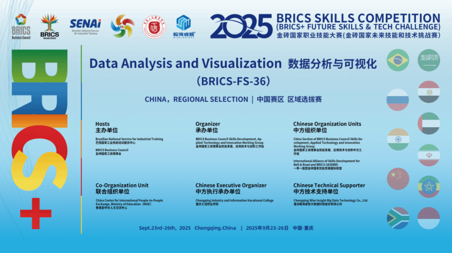 由金砖国家工商理事会与巴西国家工业技能培训服务中心联合主办的2025金砖国家职业技能大赛数据分析与可视化赛项南部赛区选拔赛,于2025年9月23日在线上举办,大数据学院胡宗容老师和独潇老师分别指导李佳胤、周紫依两位同学参加此次赛项。此次南部赛区选拔赛共吸引来自上海、四川、云南、广东、重庆等12个省市203支队伍参加,各参赛队在同等操作环境下通过线上方式远程竞技。
