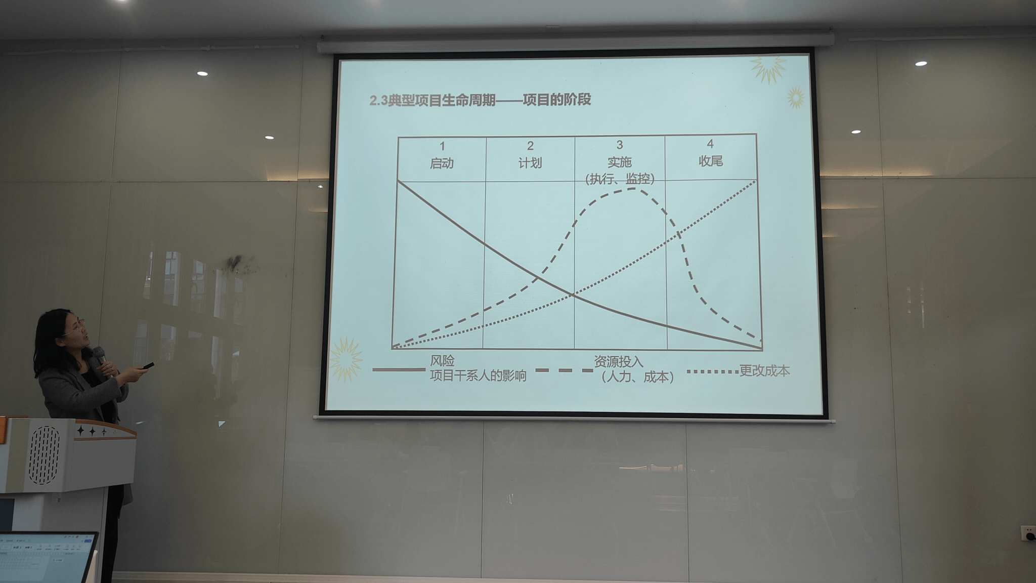 此外,吴丽娜老师借助“变更成本曲线图”,直观说明项目早期变更成本较低,而随着项目推进成本将急剧上升,帮助同学们理解前期规划与需求调研的关键意义。