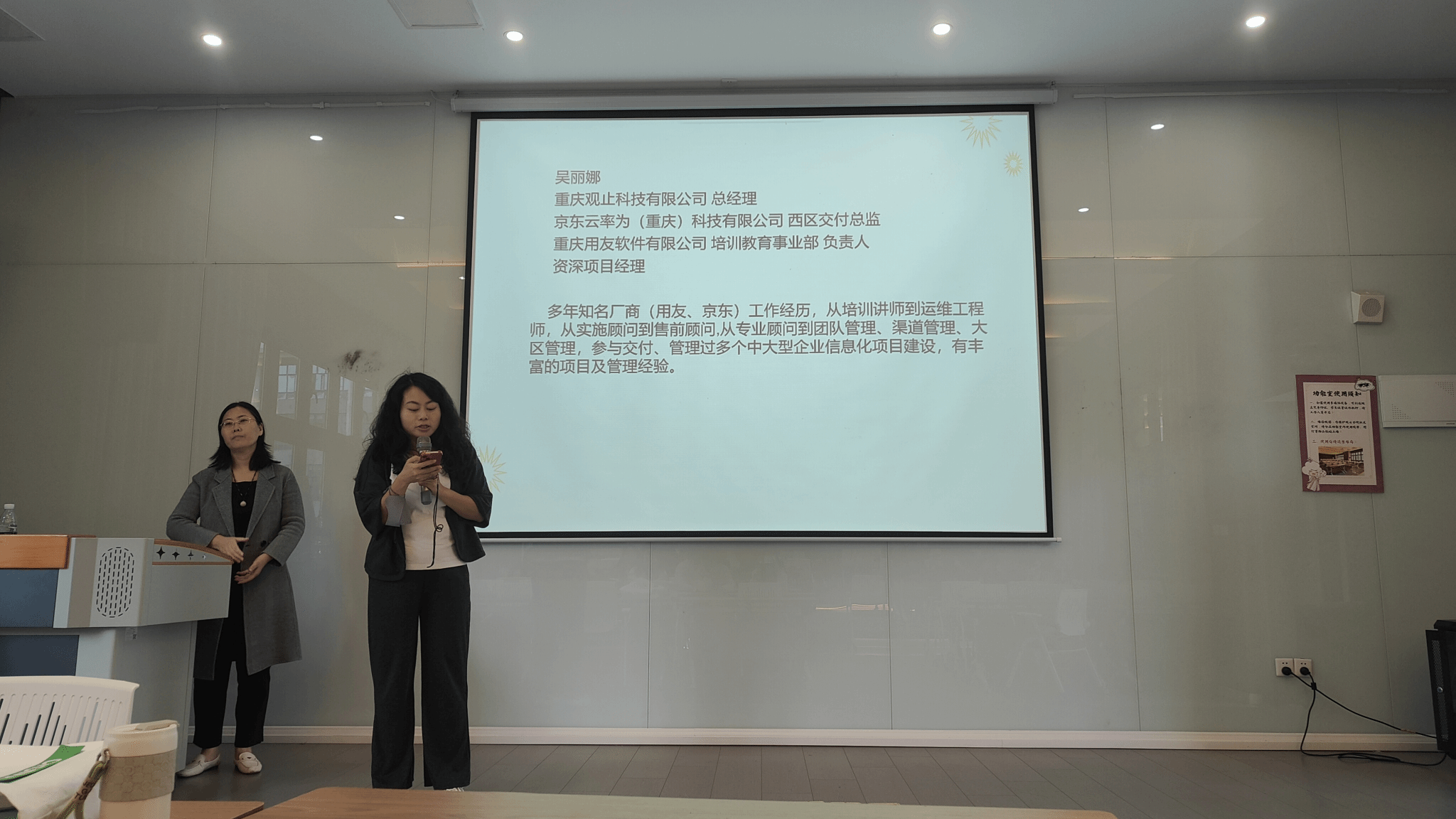 为帮助学生洞悉行业前沿动态,拓展项目管理思维,2025年10月22日下午,大数据学院在观云书院冬至多媒体教室成功举办“项目管理的艺术”专题讲座。本次讲座特邀重庆观止科技有限公司总经理、资深项目管理专家吴丽娜老师主讲,数据科学与大数据技术专业负责人徐琴老师主持,学院师生积极参加。
