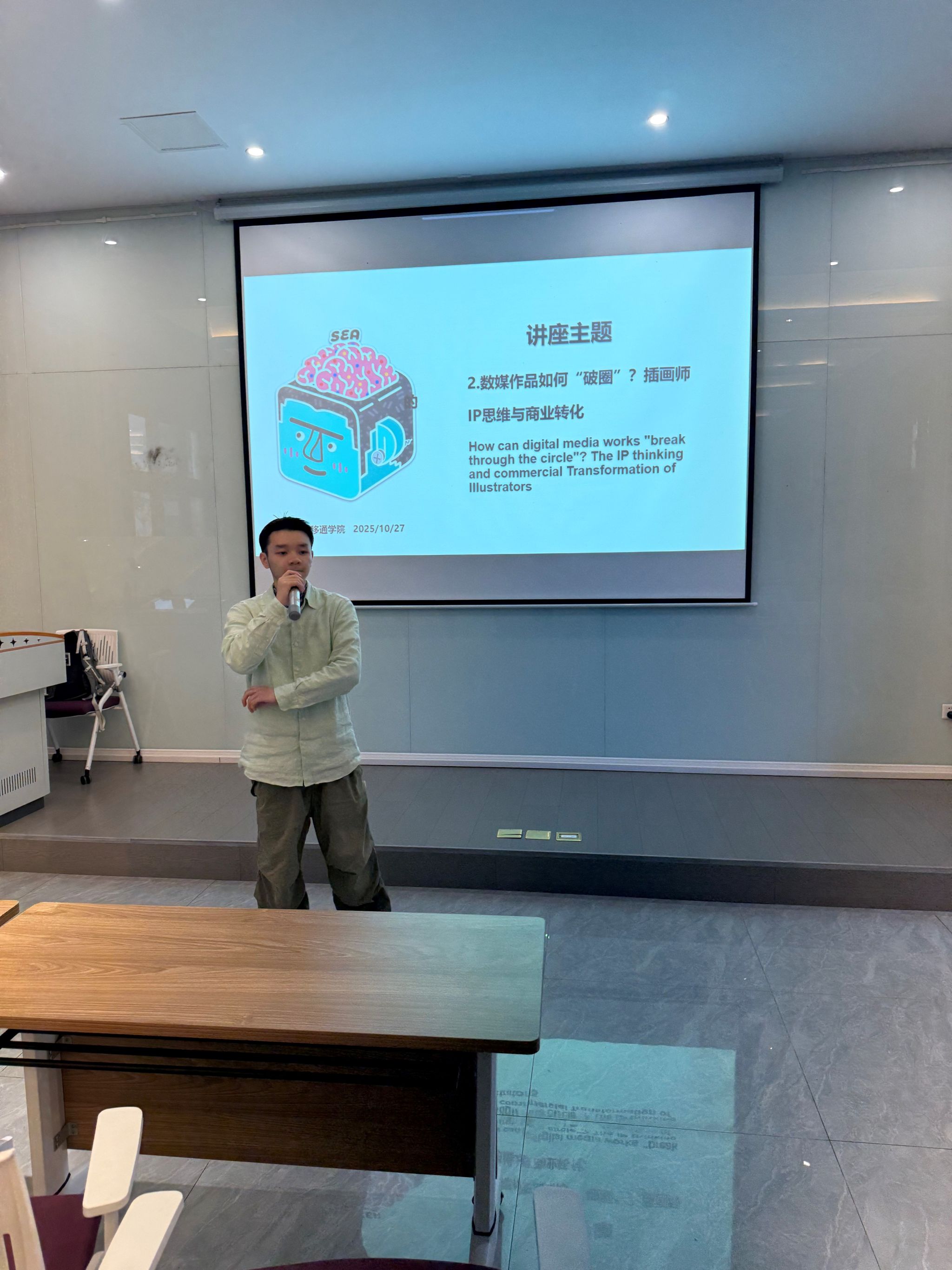 2025年10月27日傍晚五点,观云书院冬至多媒体功能室内,一场关于插画艺术如何“破壁出圈”的思维风暴正在上演。应数字媒体学院之邀,知名商业插画师袁海洋以其横跨网易、龙湖、时代美术馆等顶尖平台的丰富阅历,为在场学子带来了一场题为《不止于画:数媒人的插画赋能与竞赛高能打法》的深度分享。本次讲座摒弃常规说教,以“案例诊断+策略推演”的全新形式,直指插画学子在专业提升与竞赛突围中的核心迷思。