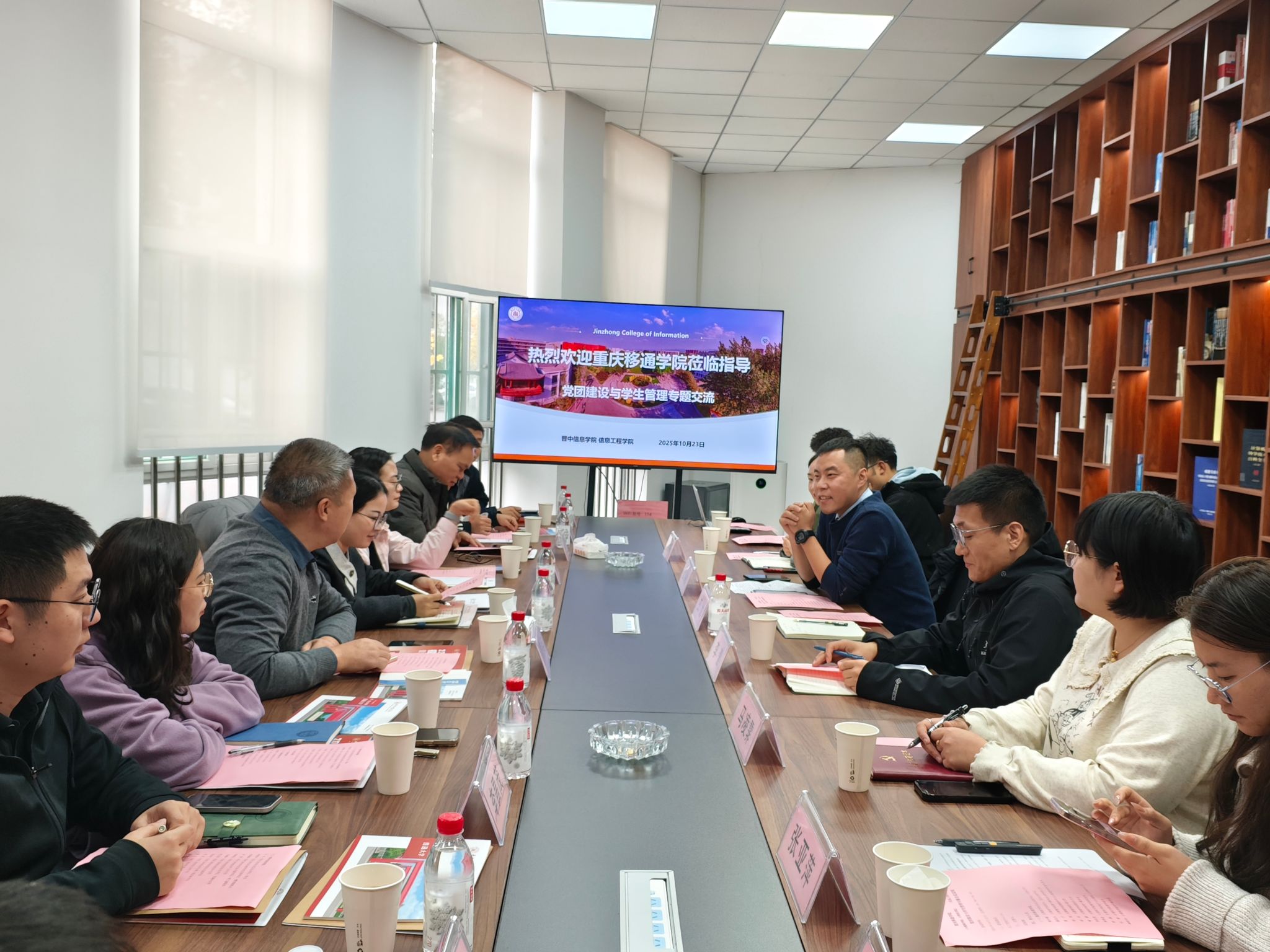 10月23日下午,交流活动以“党团建设与学生管理”专题座谈会拉开序幕。晋中信息学院信息工程学院党总支书记、院长王龙,教学副院长杨倩倩、学工副院长武海鹏,团总支书记侯林莉等领导班子成员热情接待交流团,三方围绕育人管理体系展开深入探讨。