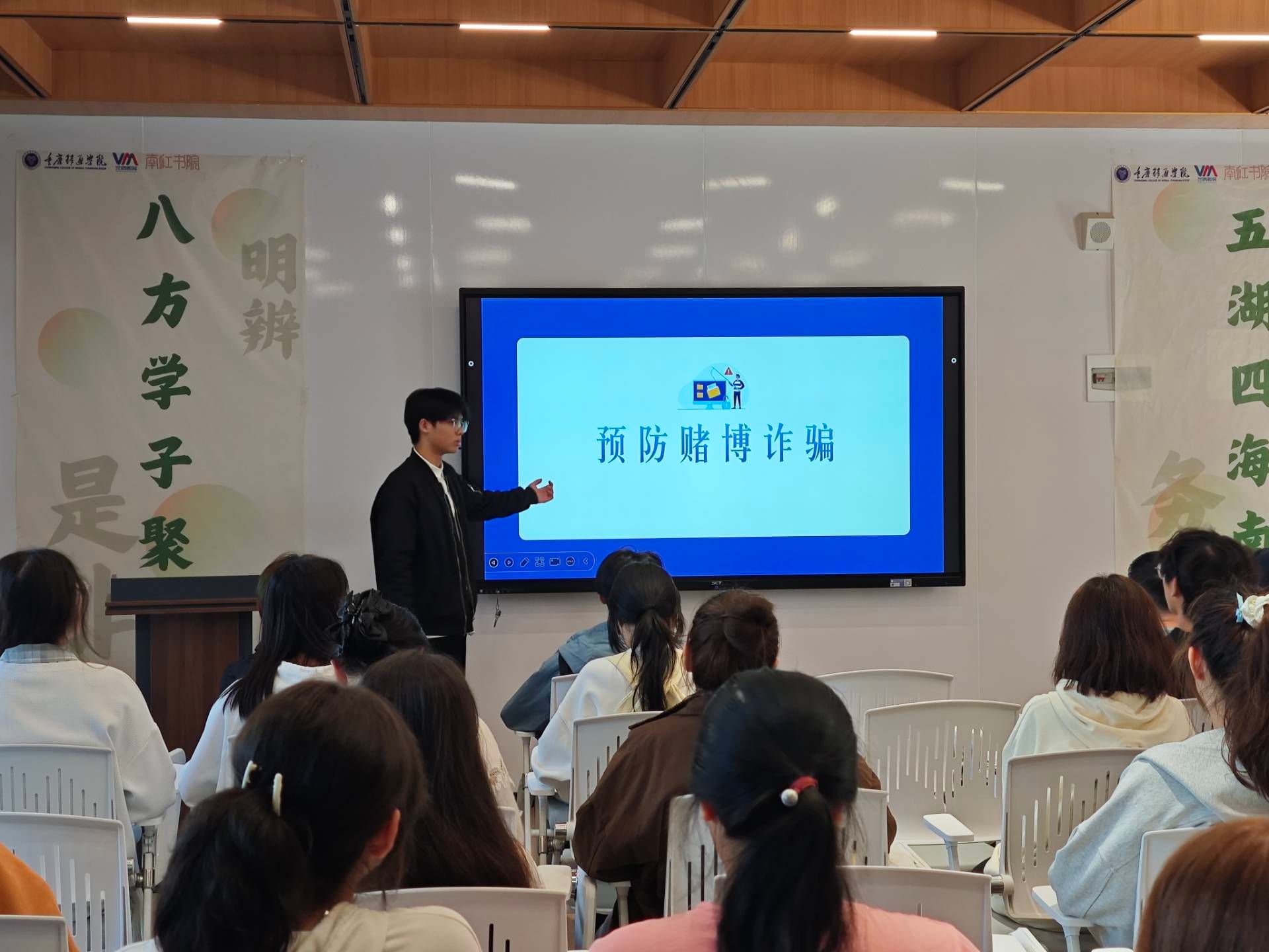2024级数字媒体技术9班班长组织同学们开展了反诈班会,班会内容丰富,形式多样,充分调动了同学们的积极性。班会以真实的案例为切入点,让同学们深刻认识到赌博的危害,增强了大家的防范意识。互动环节,同学们积极参与,踊跃发言,不仅加深了对赌博诈骗危害的理解,还学会了如何识别和防范赌博诈骗的陷阱。整个班会氛围热烈,同学们在轻松愉快的氛围中接受了反诈教育。
