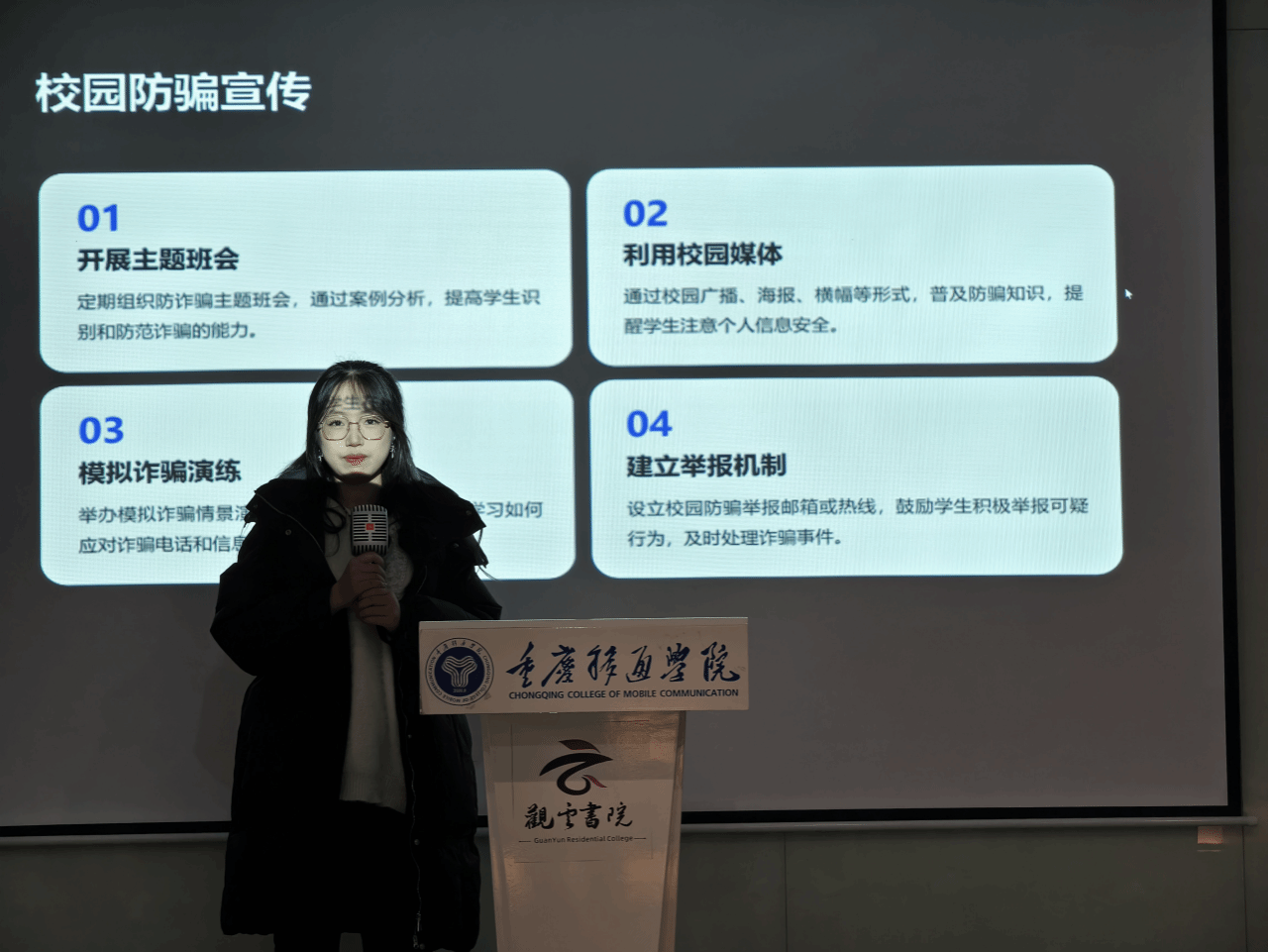 而2024级虚拟现实技术3班在防诈骗宣传的形式上别出心裁,他们录制了防诈骗视频,利用虚拟现实技术制作了防诈骗海报和视频,结合最新设计理念。班级成员们开展了一场防诈骗班会,利用多媒体设备展示了一系列防诈骗案例和资料。他们整合当下的诈骗类型,将多样的诈骗手段进行详细剖析,以生动有趣的方式向同学们传递防诈骗知识,让大家在轻松的氛围中提高防诈骗意识,积极应对可能遭遇的诈骗风险。
