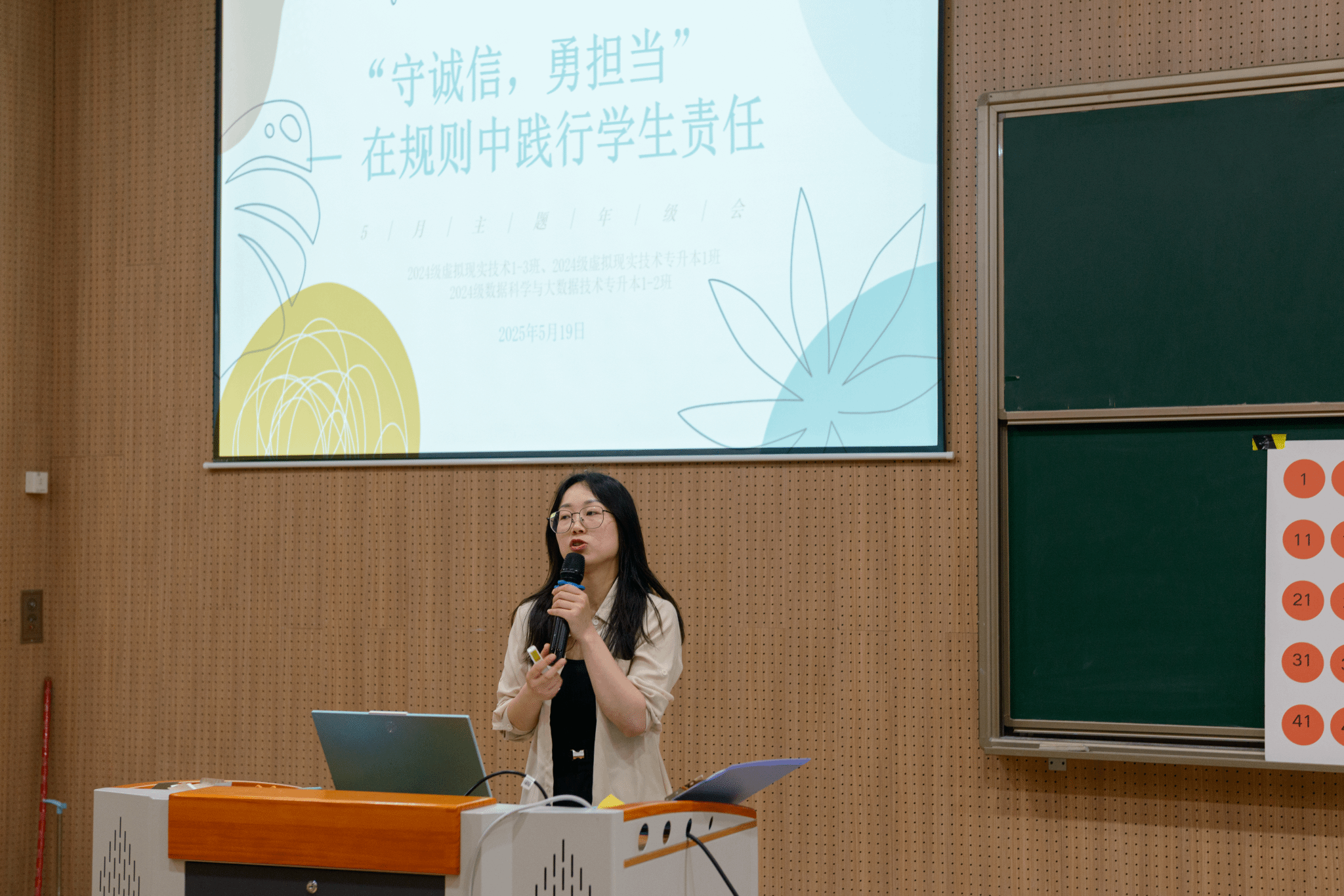 5月21日,辅导员陈安琪组织数字媒体技术1-6班开展“践信明责守规章,力行致远勇担当”主题年级会,通过多样化的活动形式,有效提升同学们的诚信意识。