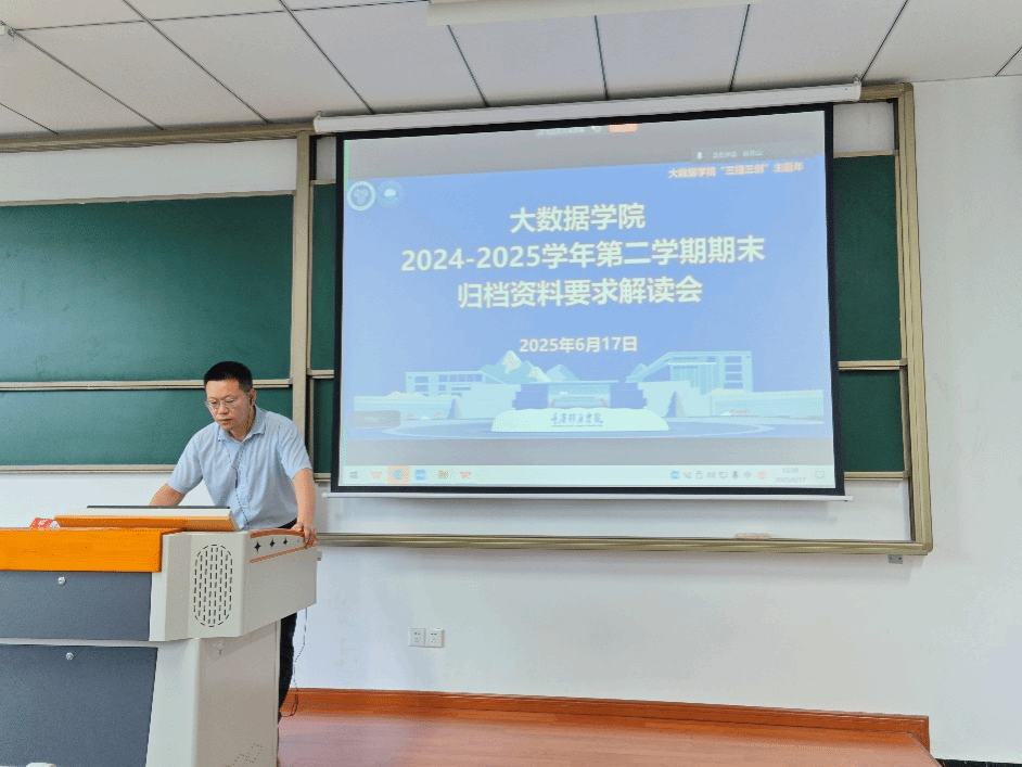 为确保毕业论文(设计)和期末教学资料归档工作的规范性和高效性,6月17日12时,大数据学院在勤者楼410召开了毕业论文(设计)及2024-2025学年第二学期期末归档资料要求解读会。本次会议由潘显兵院长主持,吕云山副院长主讲,大数据学院全体专任教师参会。