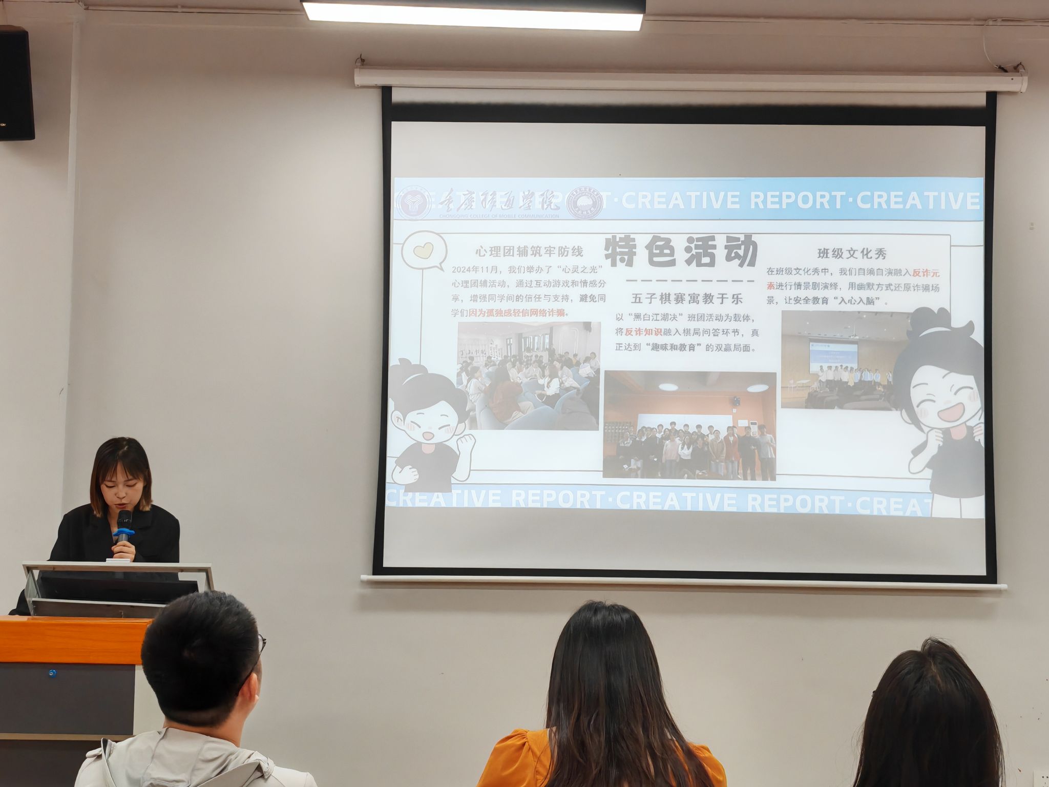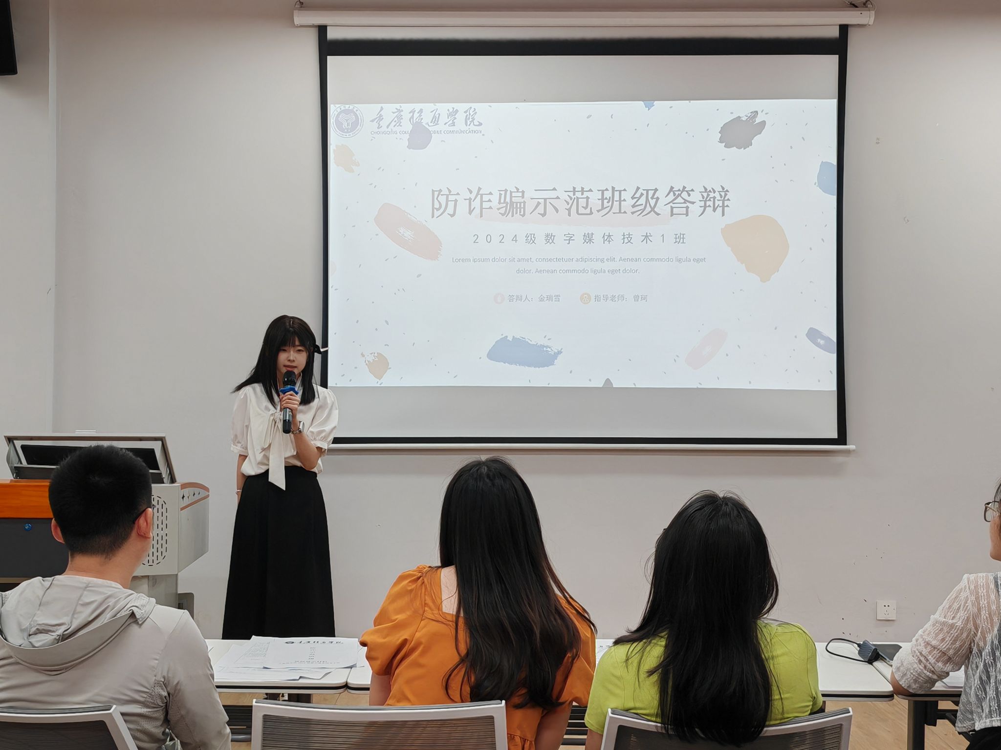 答辩现场,各班代表通过PPT、案例讲解、情景模拟视频等形式,展现班级反诈教育特色。2024级数媒6班分享定期开展的主题班会成果,2023级数媒8班则介绍运用新媒体平台传播反诈知识的创新举措等等。