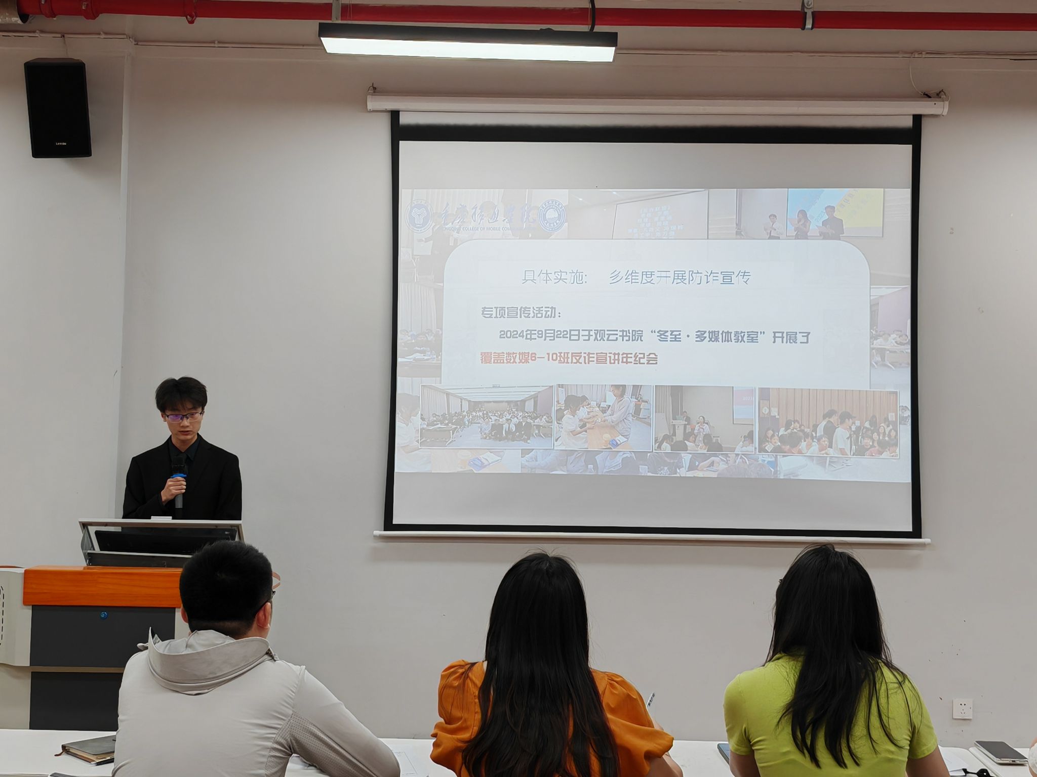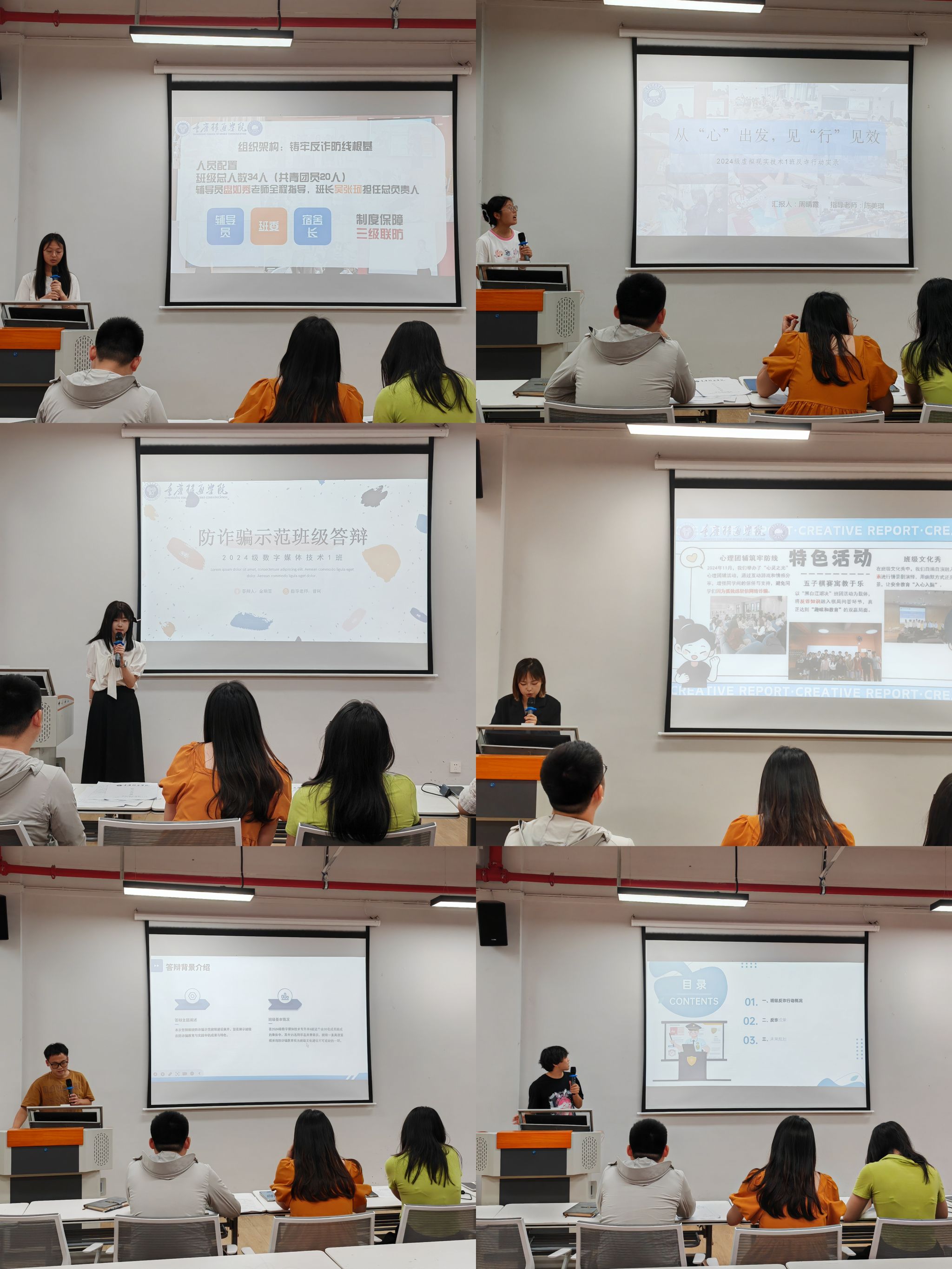 答辩现场,各班代表通过PPT、案例讲解、情景模拟视频等形式,展现班级反诈教育特色。2022级虚拟现实技术1班分享防诈情景剧、积分兑换活动等成果,2023级数字媒体技术8班则介绍防诈小品等等。