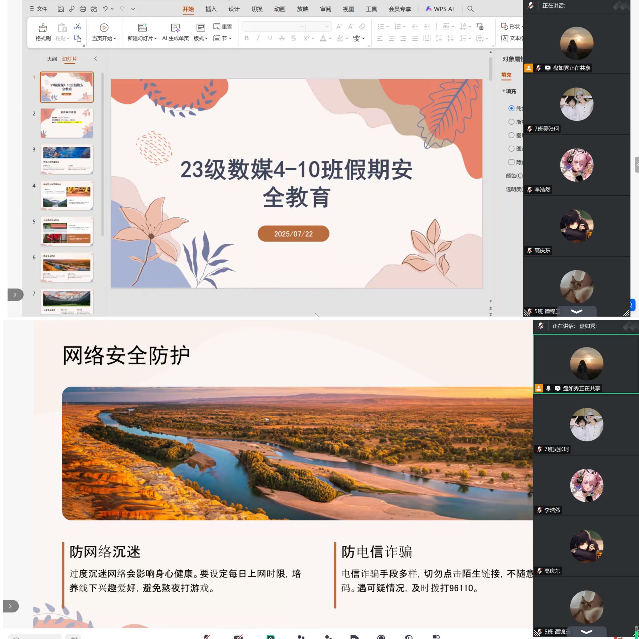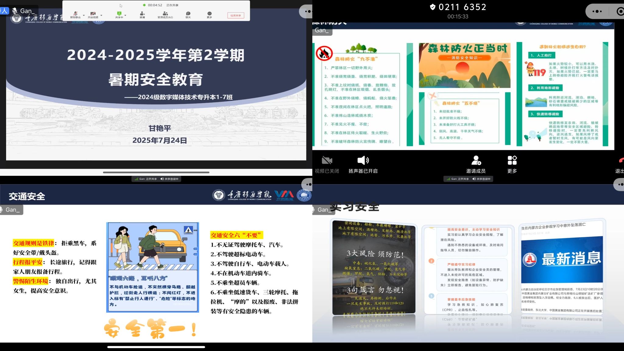 教育内容聚焦四大重点:防溺水方面,解析典型案例,强调“六不准”原则,为临水学生建立“家长-辅导员”双监护机制;防电信诈骗方面,针对大数据专业特点,剖析“AI换脸仿冒”等案例,指导学生使用“国家反诈中心”APP;出行与汛期安全方面,科普交通法规与极端天气避险知识;兼职与网络安全方面,提示兼职陷阱,强调数据加密与信息保护。