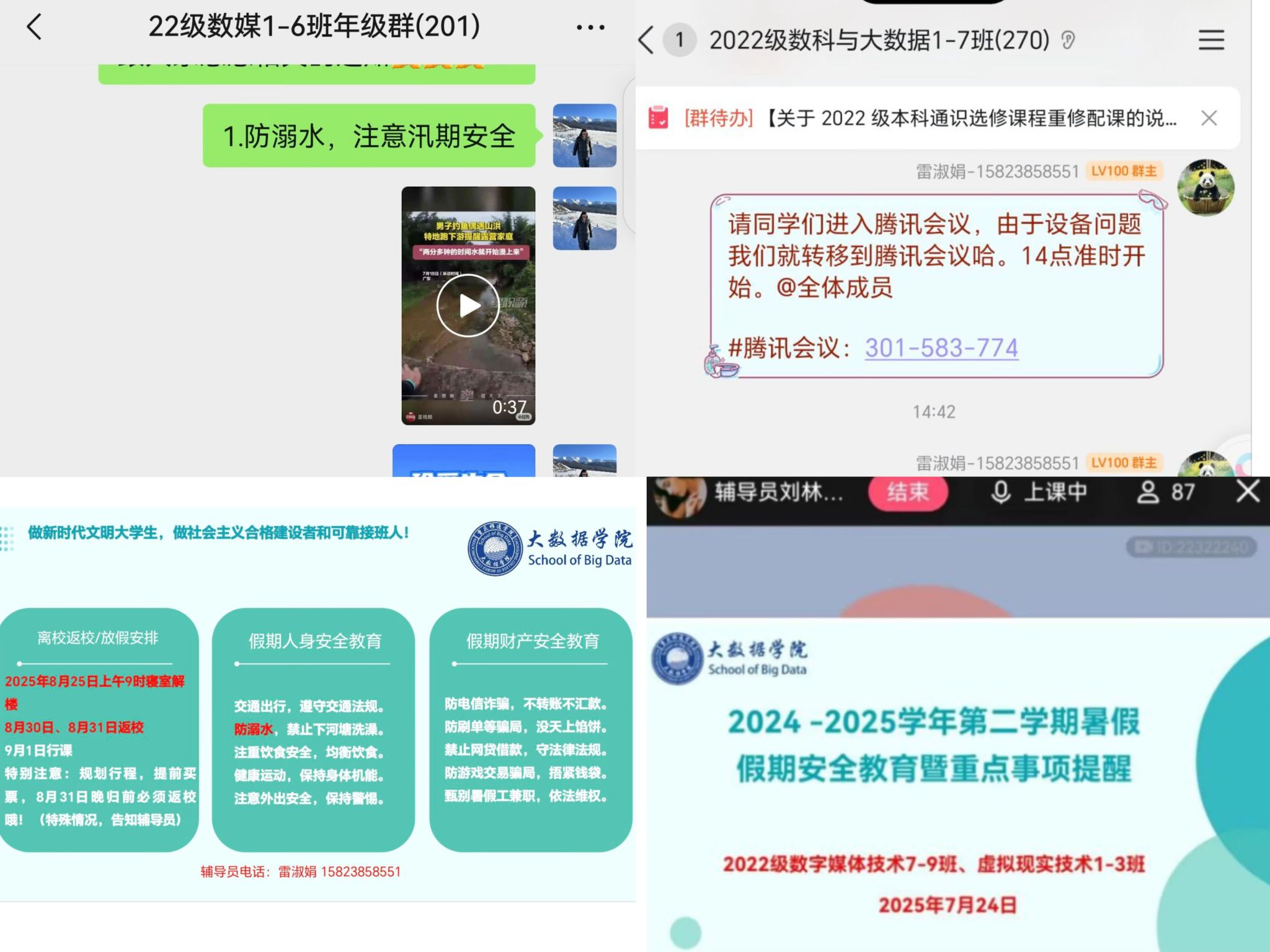 为保障学生暑期安全,响应学校部署,大数据学院于7月18日至25日开展“暑期家校联动护安全”宣传教育活动,通过线上线下结合的方式,强化学生安全意识与风险应对能力。