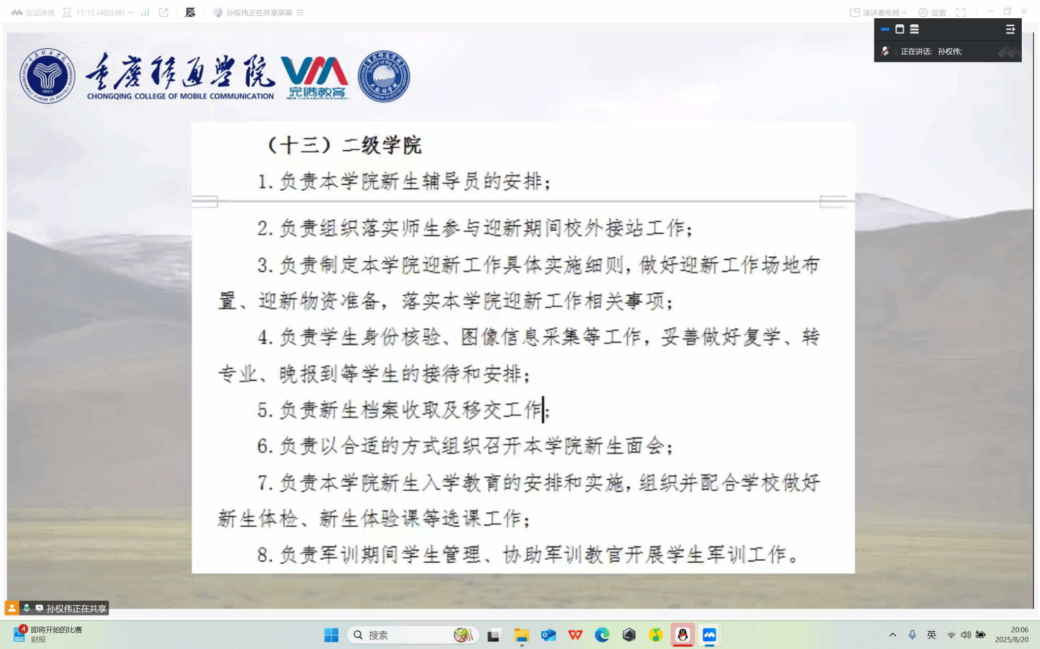 本次会议主要围绕迎新工作的相关安排,辅导员孙权伟老师强调了班导师工作在学生成长过程中的重要性。孙老师指出班导师不仅是学生学业上的引路人,更是生活中的知心人,肩负着帮助新生辅导员老师引导学生树立正确价值观、培养良好学习习惯和生活作风的重任。同时,也希望班导师们能够做好“传帮带”,履职尽责,以严谨细致的工作态度、踏实务实的工作理念,为全体新同学的成长提供全方位支持,帮助新生尽快适应大学生活。