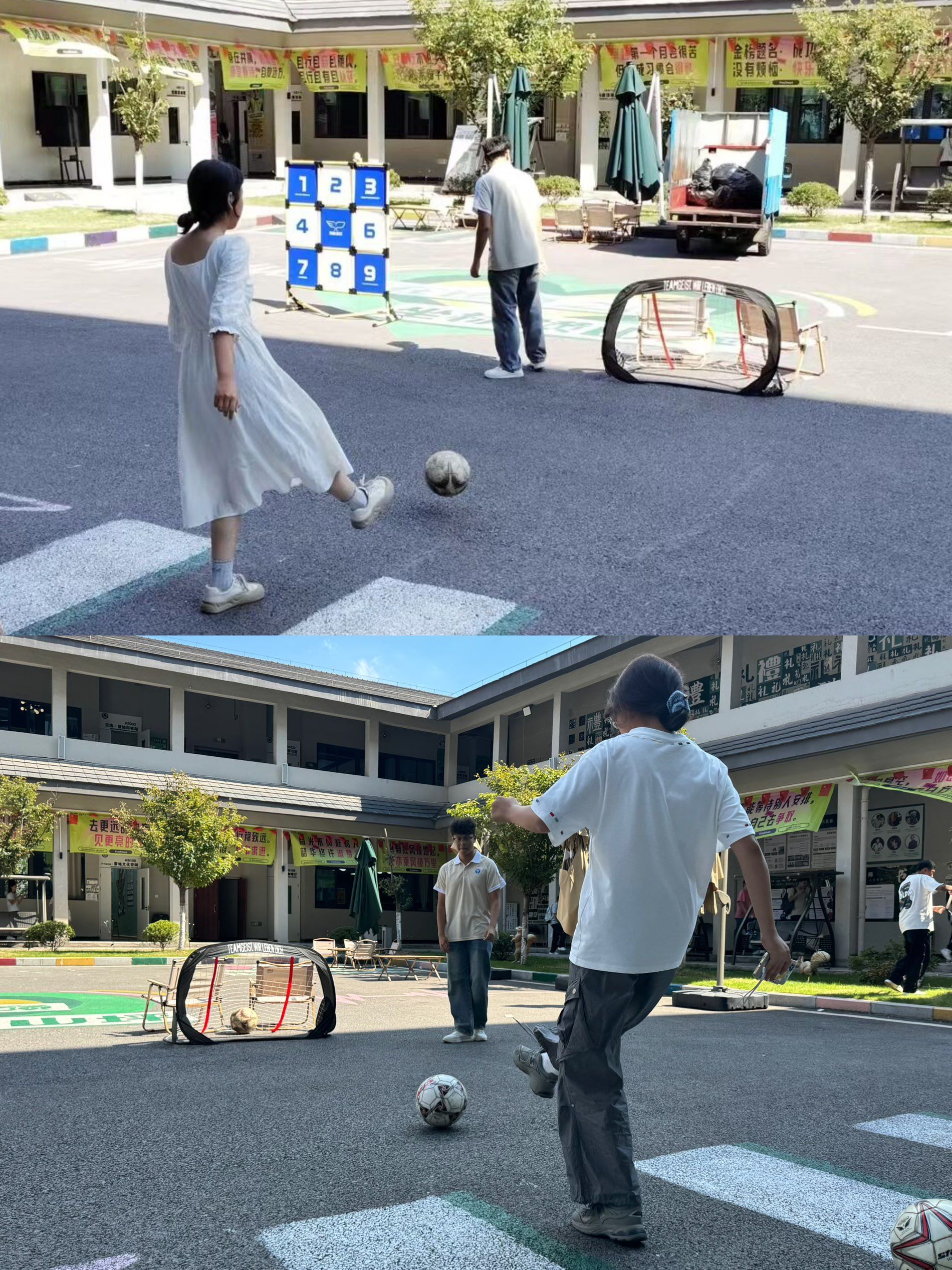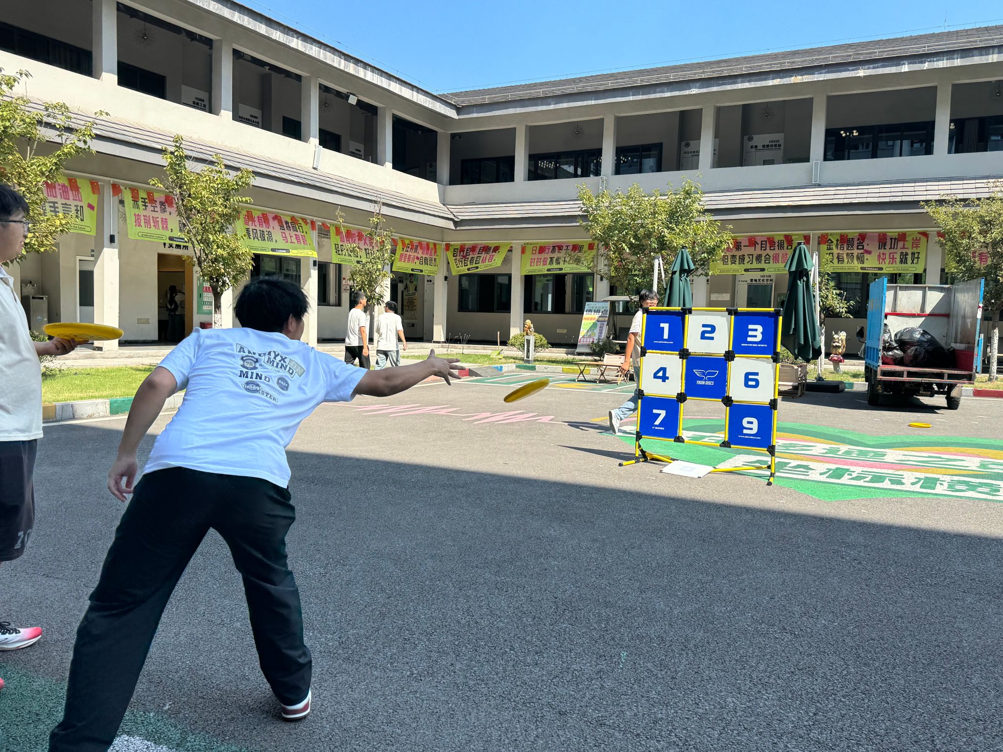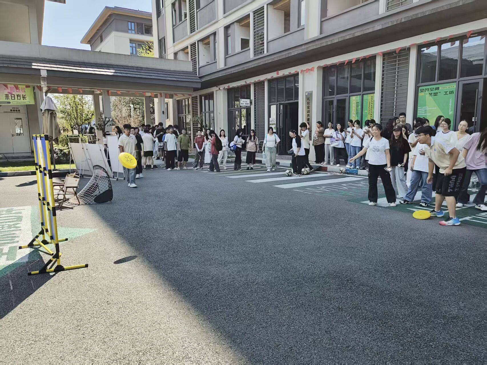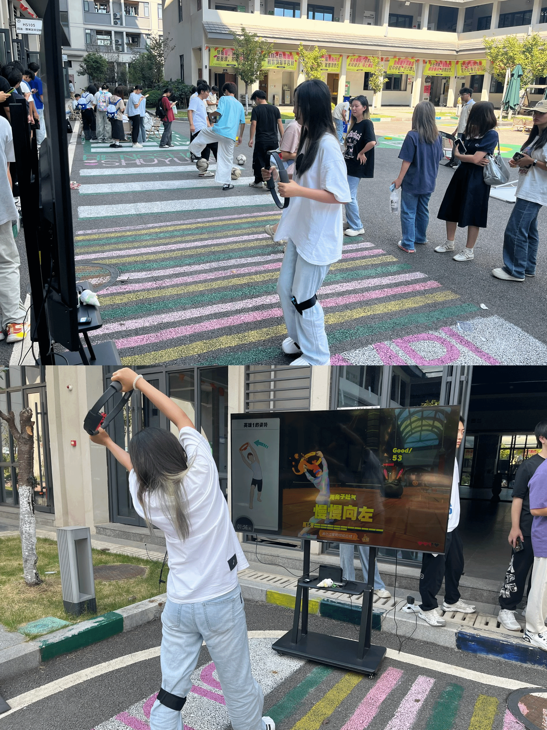 掷飞盘、足球射门两大运动关卡前,欢呼声此起彼伏。同学们瞄准九宫格飞盘靶投掷,为每一次得分喝彩;在小球门前专注射门,尽情释放活力,通关盖章机制更让参与热情持续高涨。健身环体验区同样满是欢声,借助游戏化场景,同学们在互动闯关中完成肢体运动,实现“运动解压+游戏疗愈”的双重效果。