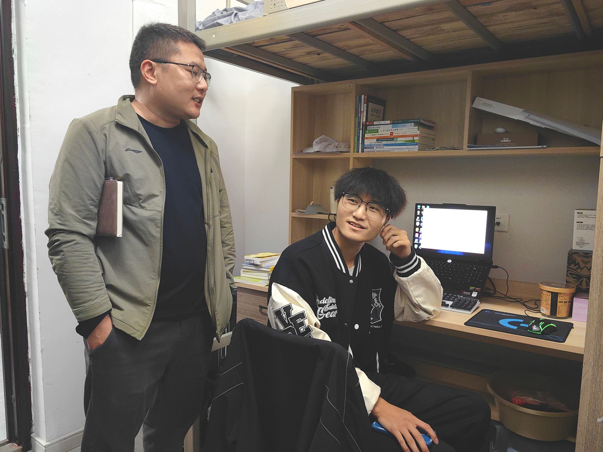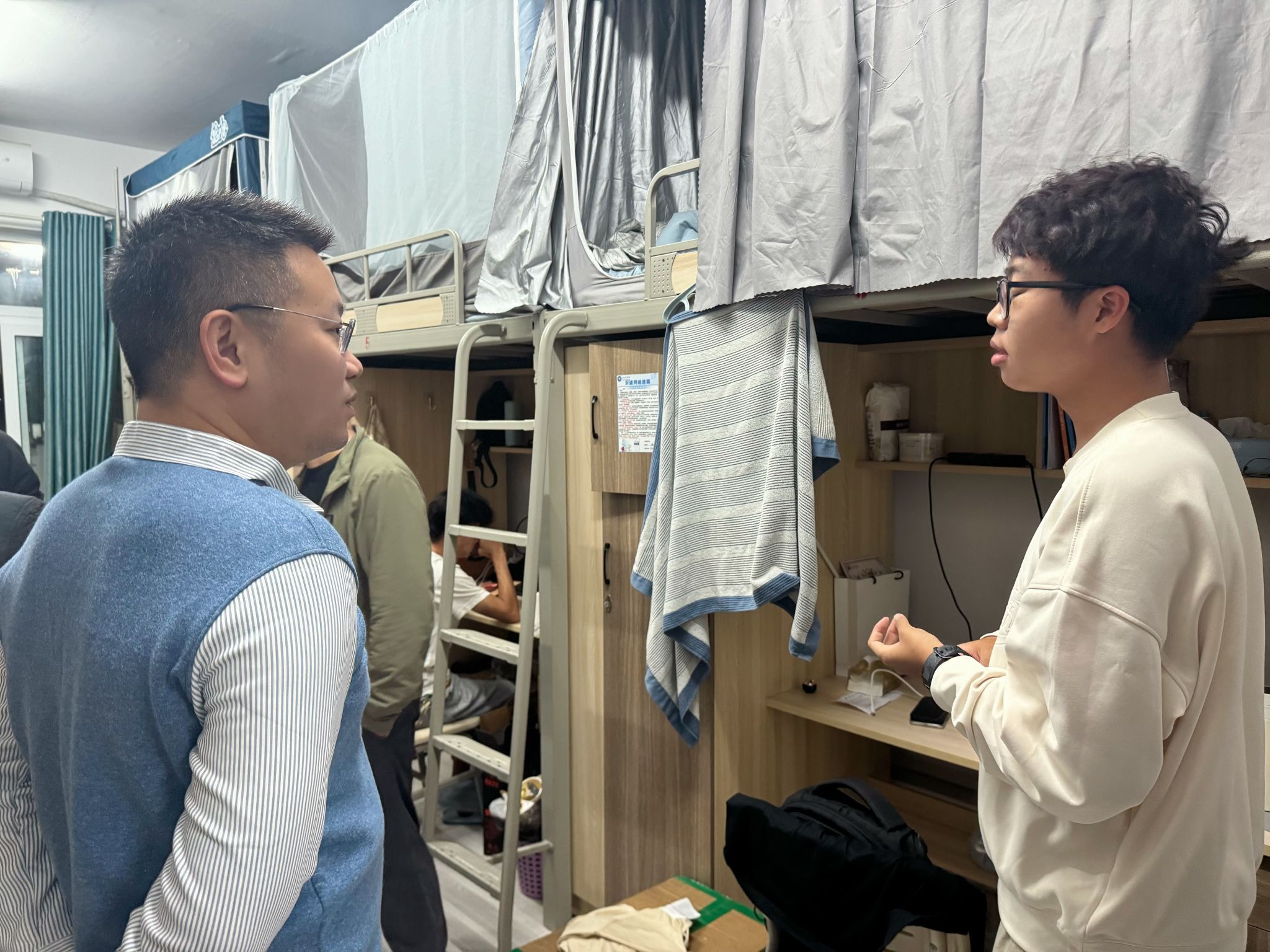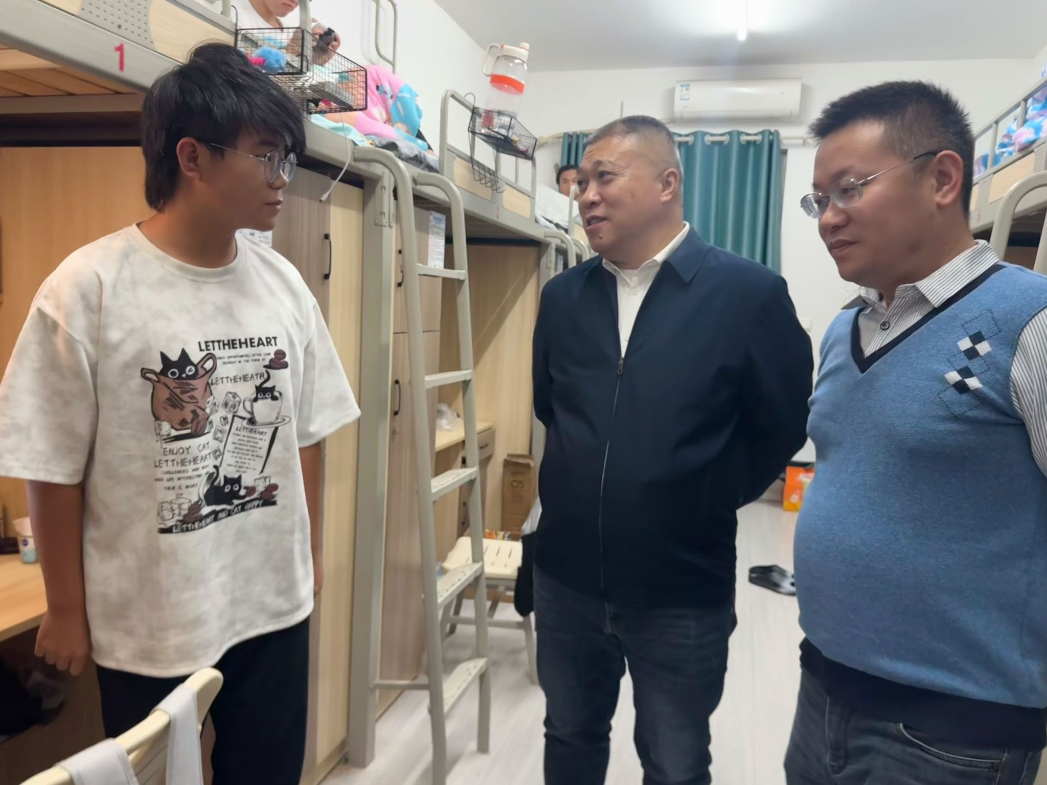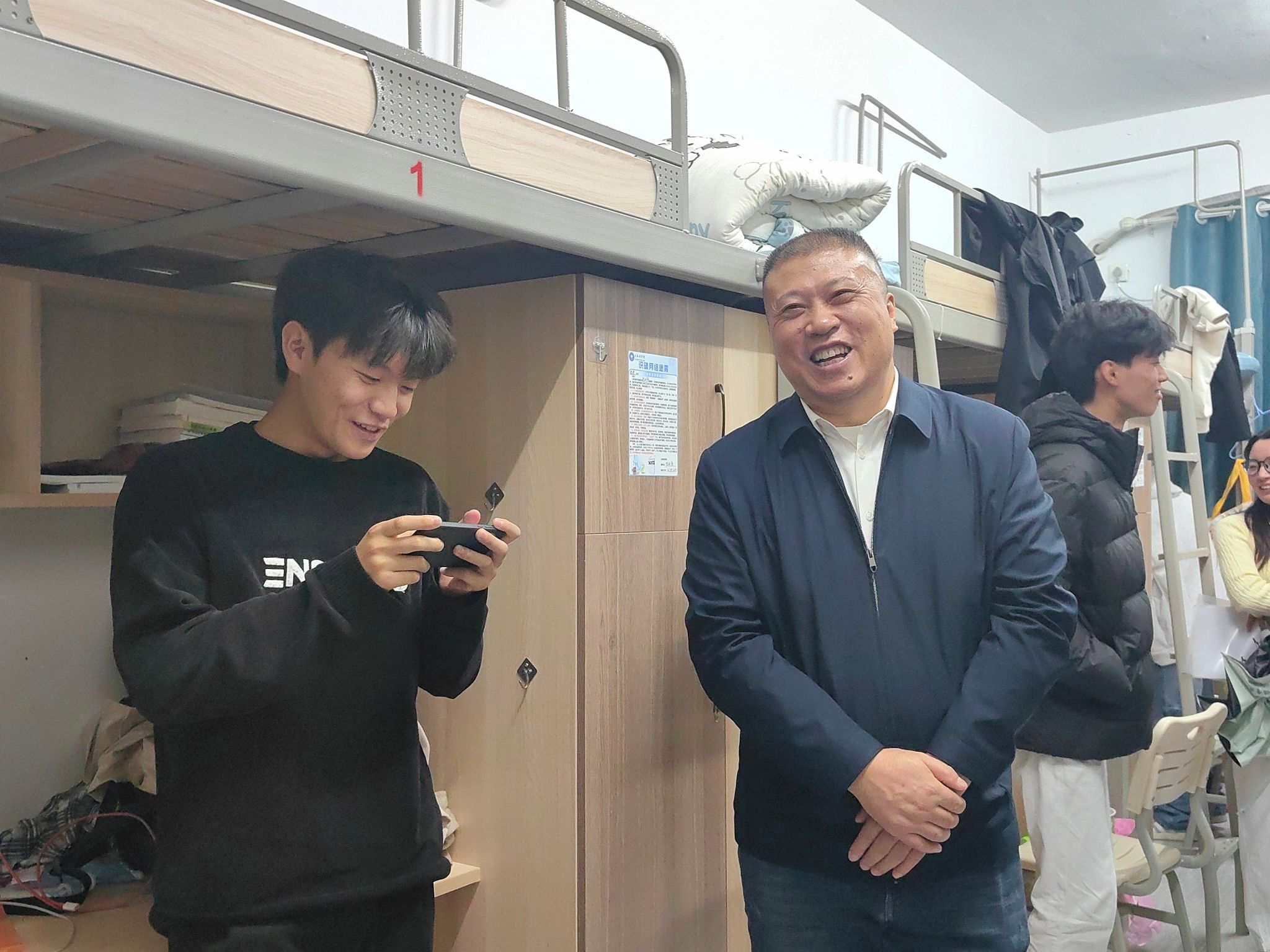 为深入了解学生在校的生活状态和学习情况,掌握学生思想动态,优化宿舍生活环境,防范诈骗推销等行为,切实关心关爱同学们的成长与发展,大数据学院于2025年10月29日晚19:00在瀛溪书院二号楼开展了10月联合查寝工作。此次查寝由大数据学院院长潘显兵、副院长吕云山以及各学科教研室主任、全体辅导员老师共同参与,聚焦新生需求,从生活询问、安全引导到专业疑问,用细致问候与实用建议,为学生们送上学院的温暖关怀。