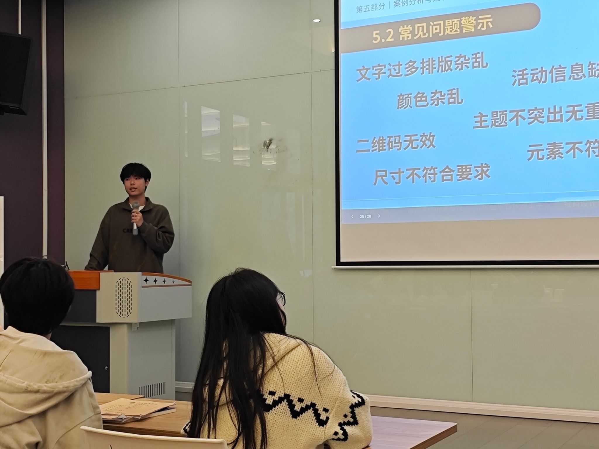 结合过往实例,宋文轩学长梳理了同学们在物料制作中的典型问题,并作出警示,他特别指出三类常见弊病:一是字体杂乱,一份物料使用过多字体,缺乏统一规范;二是色彩失序,颜色过多过艳,无主色统领,影响视觉舒适度;三是信息缺失,遗漏关键时间、地点、主办单位等核心内容。