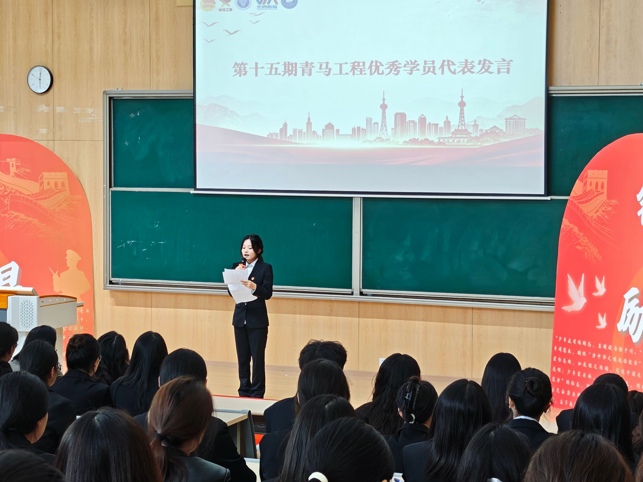 第十五期青马工程优秀学员代表彭天意上台分享学习感悟,从理论学习、社会实践等方面传递宝贵经验,为新学员树立榜样。大数据学院党总支副书记阙小梅老师发表致辞,既肯定往期青马工程成效,也寄语新学员“立大志、明大德、成大才、担大任”,鼓励大家在青春赛道上奋力书写担当答卷。