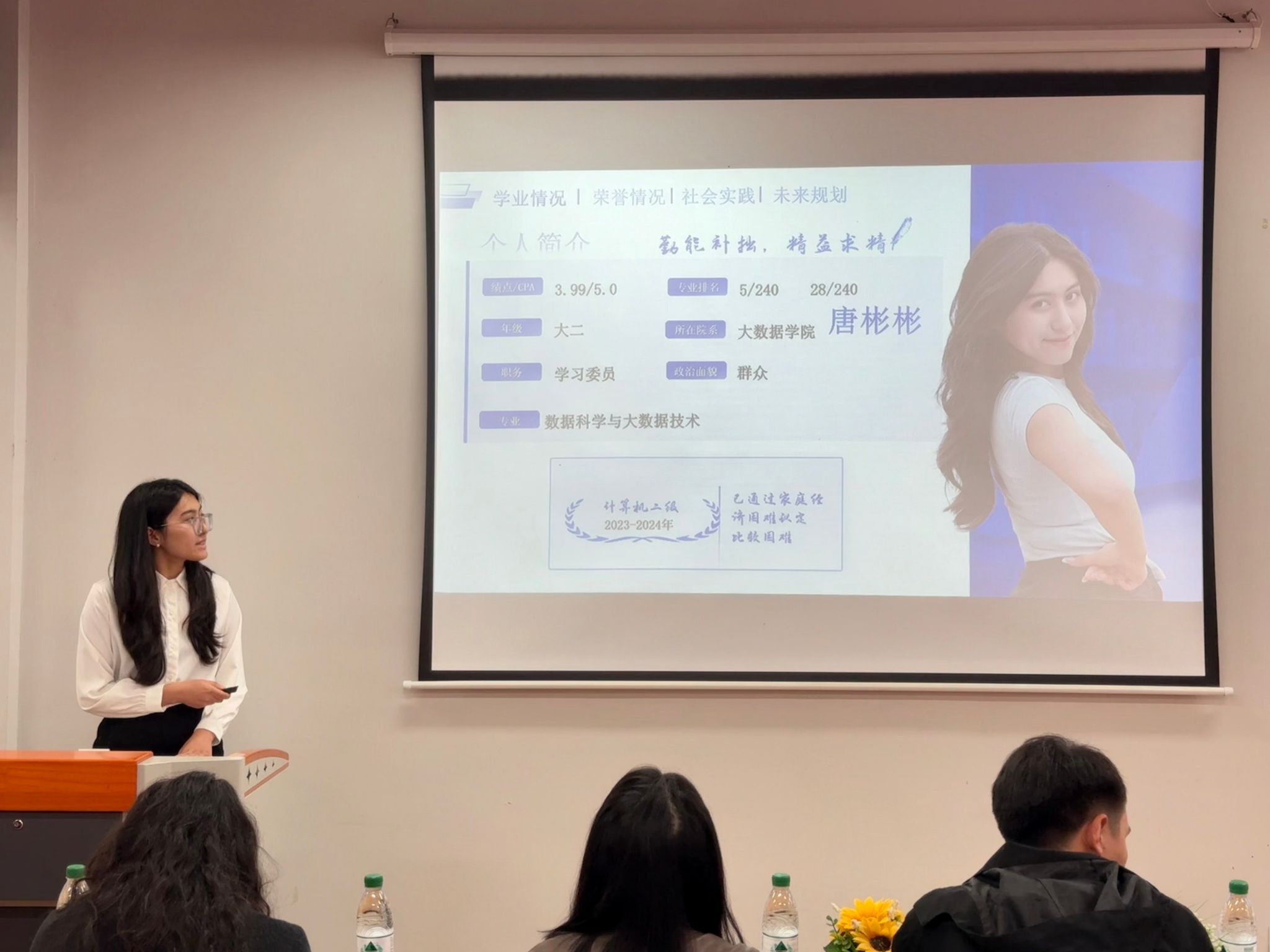 主持人首先介绍了本次答辩的规则与流程,随后各位答辩人依次上台,从学业情况、荣誉成就、社会实践、未来规划等多个方面进行展示,凭借扎实的专业成绩、丰富的社会实践经历等,条理清晰的进行阐述。此次答辩激励着更多同学以他们为榜样,努力拼搏,展现出大数据学院学子积极向上、锐意进取的精神风貌,在未来的学习和生活中继续绽放光彩。