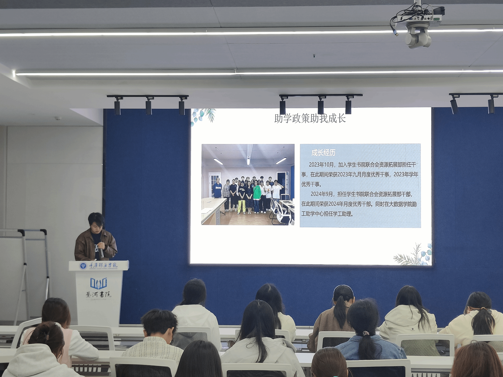 主持人简短开场后,进入获奖同学分享环节。4位分别获得国家奖学金、国家励志奖学金、国家助学金、筑梦奖学金的同学,结合自身经历,围绕资助政策申请、学业规划等内容展开分享,用真实案例解读政策细节,为在场同学提供了可借鉴的实用经验,让同学们对各类资助政策有了更直观的认知。