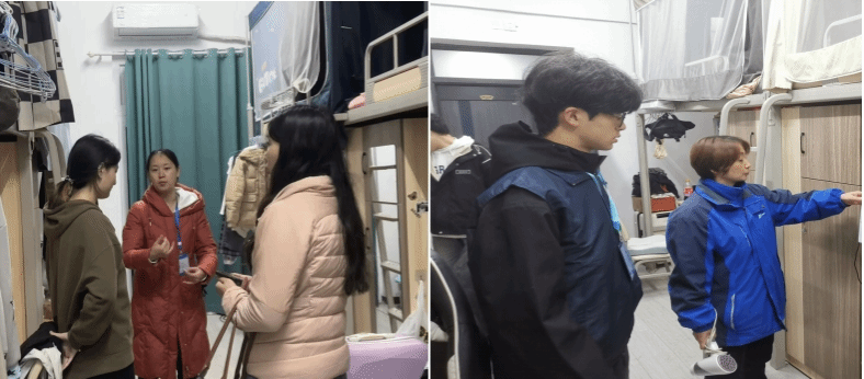 同时,宿管中心联动辅导员们,分别前往南江书院、丁山书院、观云书院、古剑书院四个楼栋,全面细致地走访学生宿舍。过程中,他们细心查看宿舍卫生状况、用电安全、消防设施等细节,重点排查违规电器使用、私拉乱接电线等安全隐患,对发现的部分问题现场提出整改建议并督促落实,维护宿舍安全。