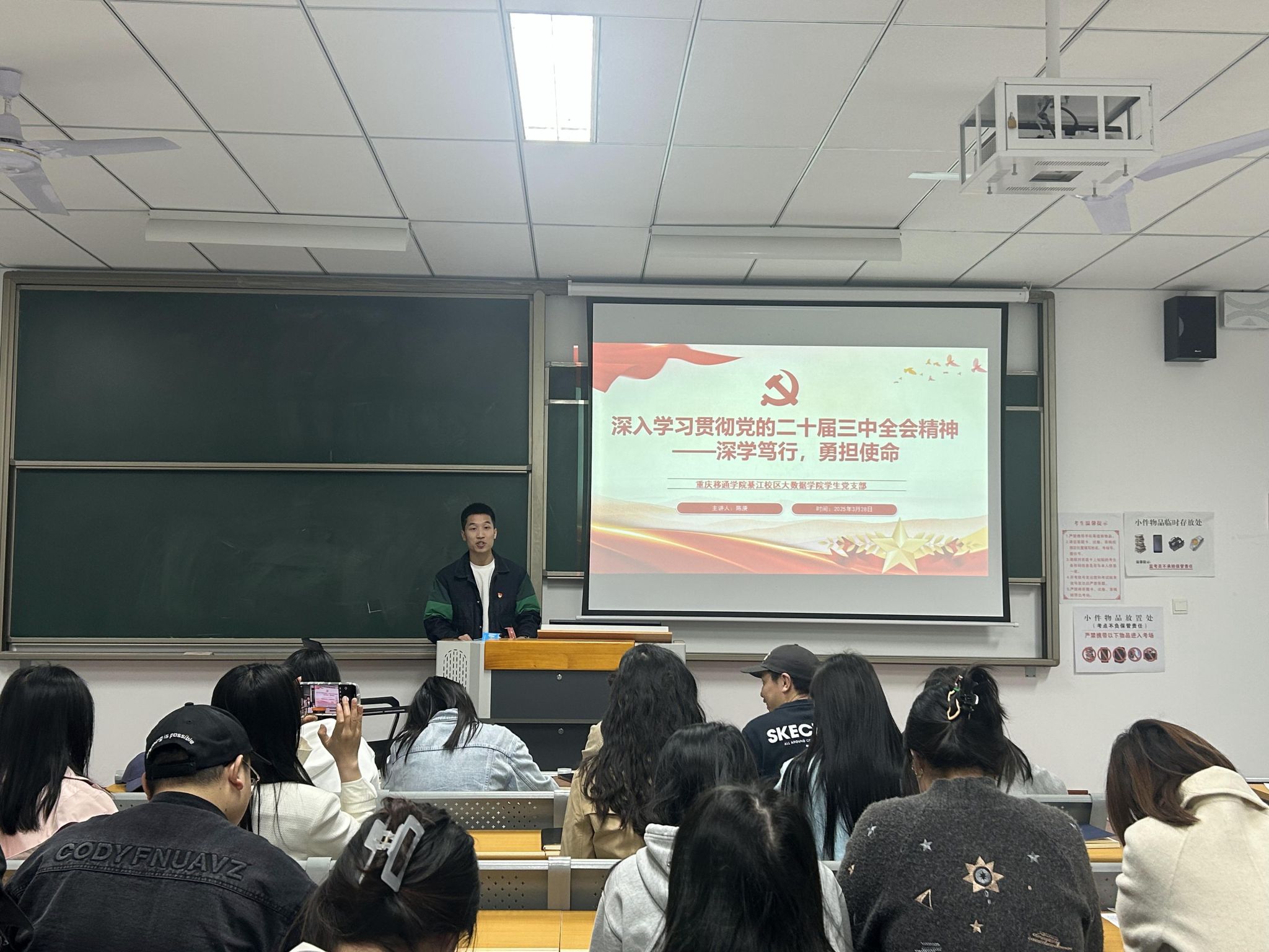 党员代表陈庚同志以“深学笃行,勇担使命”为主题,聚焦党的二十届三中全会基本概况,结合自身学习体会带领党员同志们一起深入学习理论知识,领会会议精神的核心要义。他强调作为新时代的青年党员,要勇于担当历史使命,积极投身到学校发展与国家建设中,以实际行动践行党的初心和使命,在新时代征程中贡献自己的青春力量。他的分享也提醒着各位党员同志需要以全方面发展来严格要求自己,时刻意识到肩负着的责任以及义务从而展现新时代党员教育双融合的创新探索。
