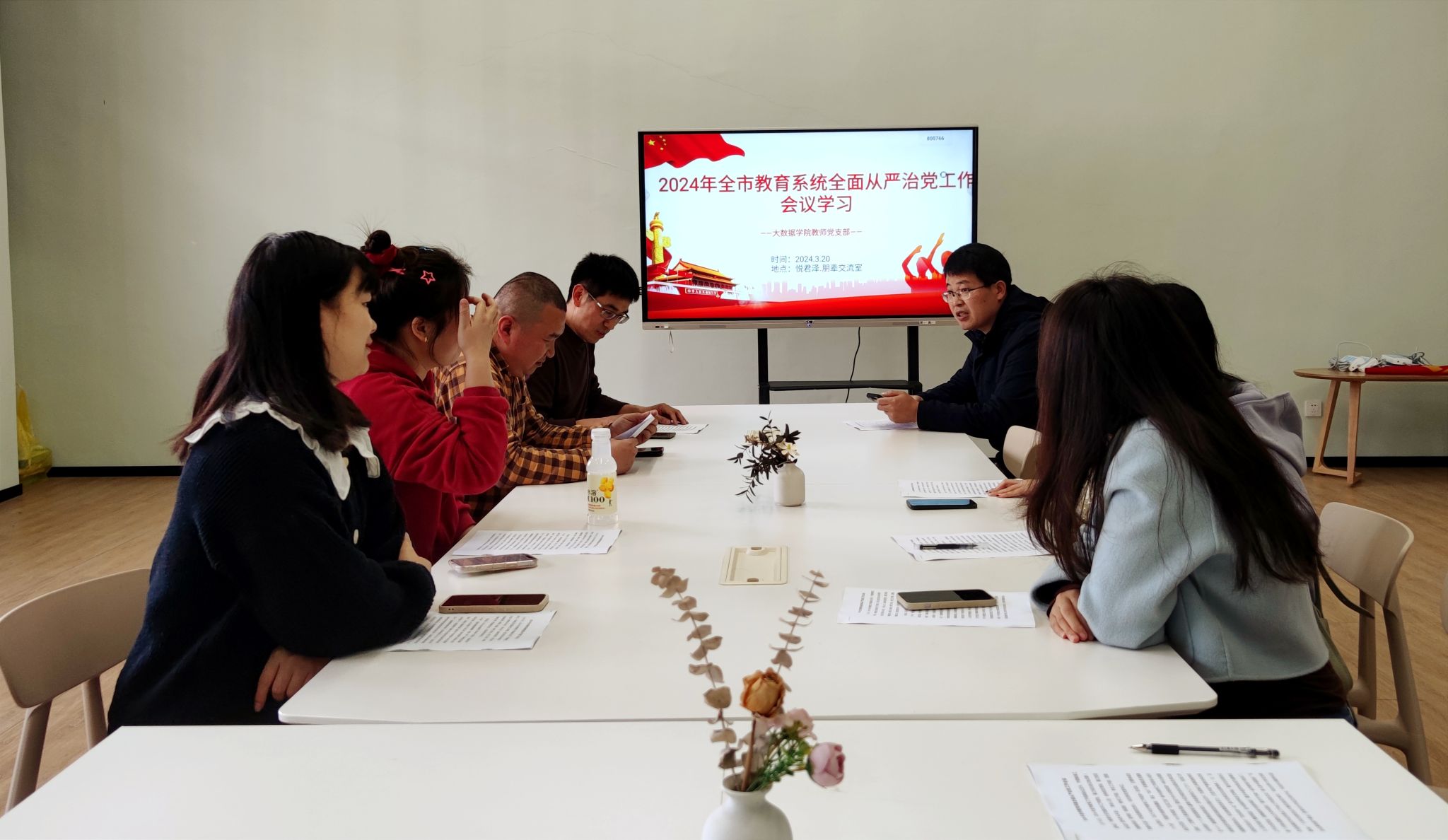 近日,全市教育系统全面从严治党工作会议在綦江校区隆重召开,为深入学习贯彻会议精神,大数据学院积极响应,于3月20日下午2点组织开展了专题学习会议。本次分享会由大数据学院院长闫会峰主讲,大数据党支部全体教师参加此次会议。