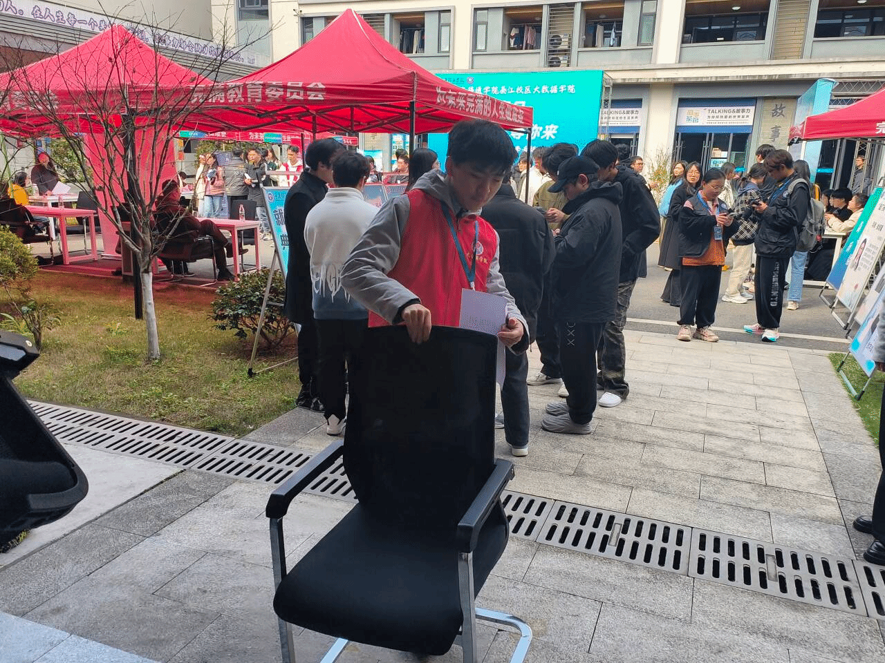 虽然双选会在10:30正式开始,但早上8点刚过,志愿者们已早早聚集在綦河书院2号楼。志愿者们分区域布置会场:摆放桌椅、设置指示路牌、关键点位安排专人值守、对应摆放企业介绍立牌等。每一个细节都体现着他们的用心与责任感。正如雷锋对待工作一丝不苟的态度,志愿者们全力以赴,为双选会的顺利开展奠定了坚实基础。他们的默默付出,不仅为活动搭建了坚实的框架,也让毕业生们感受到来自校园的温暖与支持。