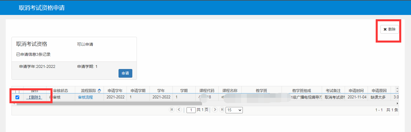 5.未审核前,如需撤销申请,则选中记录,点击删除。